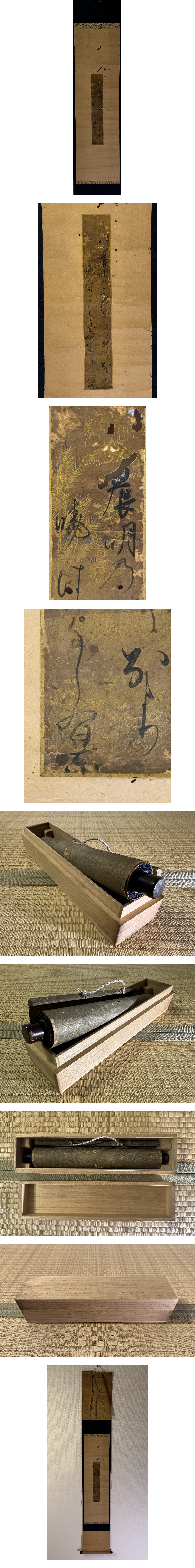 表装 約152㎝ ×約24㎝ 本紙 約35㎝ ×約5.5㎝ 桐箱・虫なめ・小穴・軸紐直し・経年の痛みあり。 【作者不明】古歌 唄 詠 詩 短冊幅 掛軸 / 消息 |