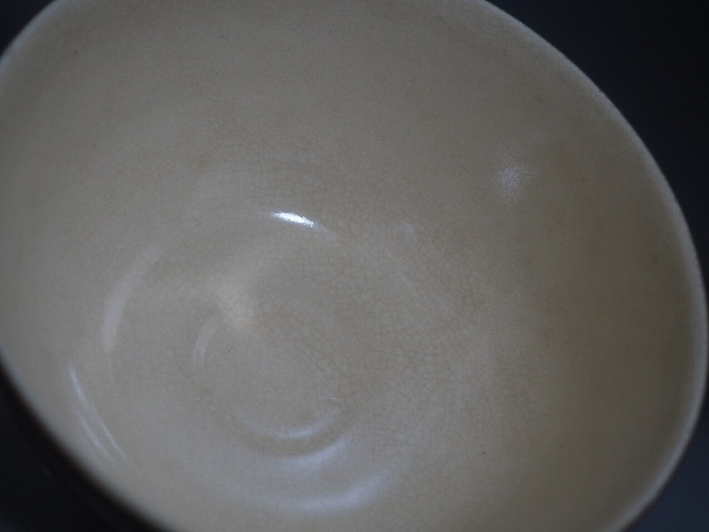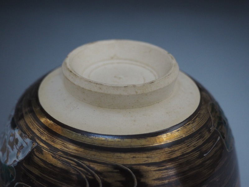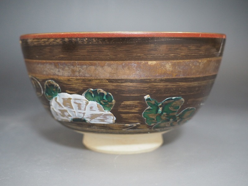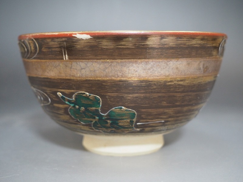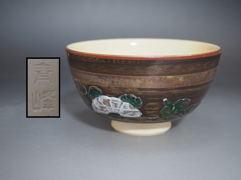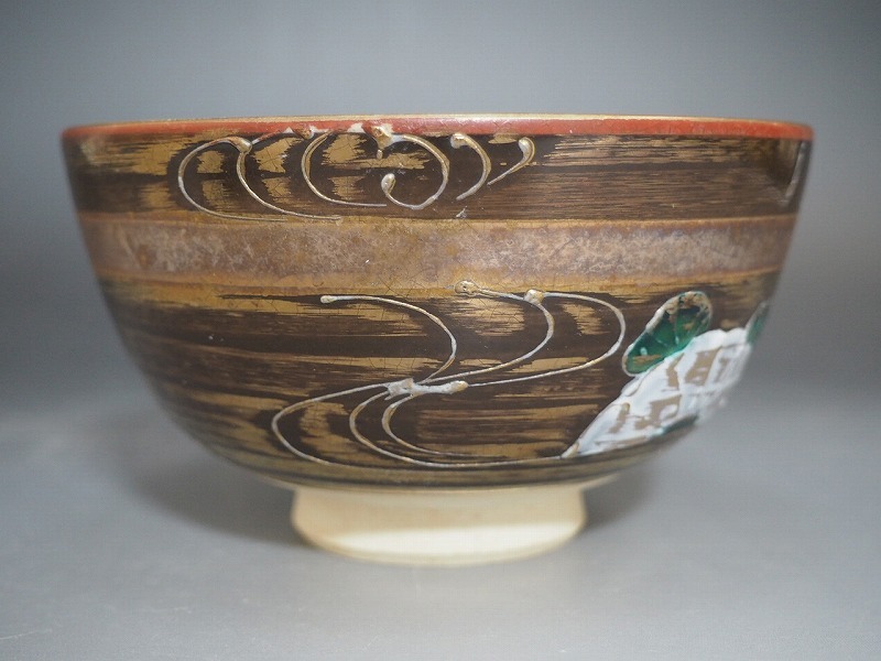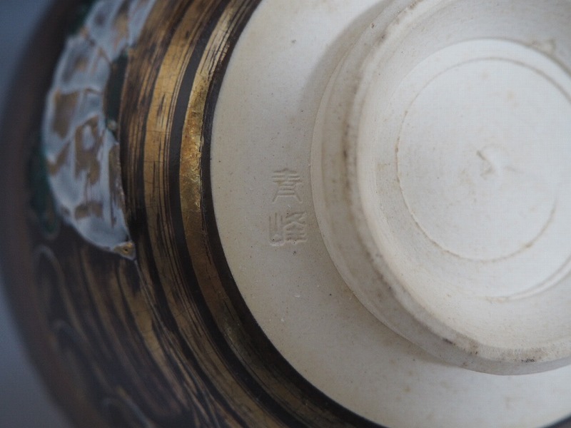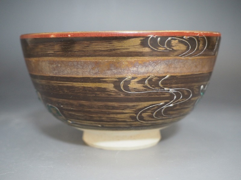 | A3663 青峰 作 金地流水文茶碗 ☆ 茶道具 抹茶器 茶器 抹茶道具 茶懐石 茶事 茶の湯 茶碗 抹茶碗 陶器 作家物 在銘 陶印 窯印 良品 無傷 | ||