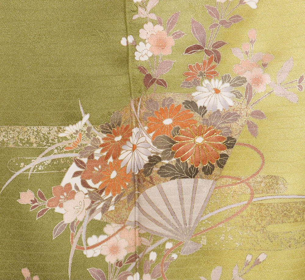 色・柄 | 訪問着 袷 丹後縮緬 辛子色(緑黄色)・抹茶色(苔色)暈し・ 籠目綸子地 花扇子 菊・桜・南天・椿 (写真では上手く色が出ない場合があります。ご了承下さい) |