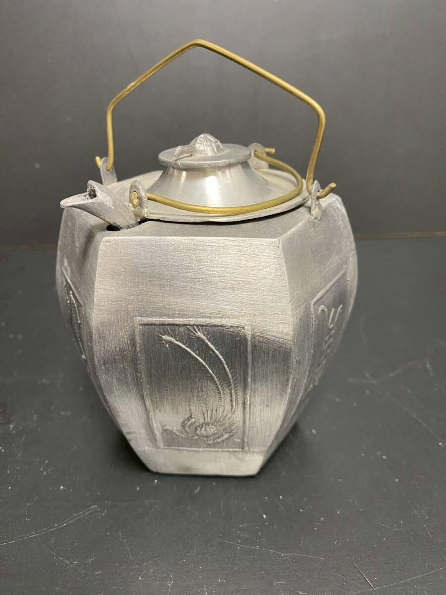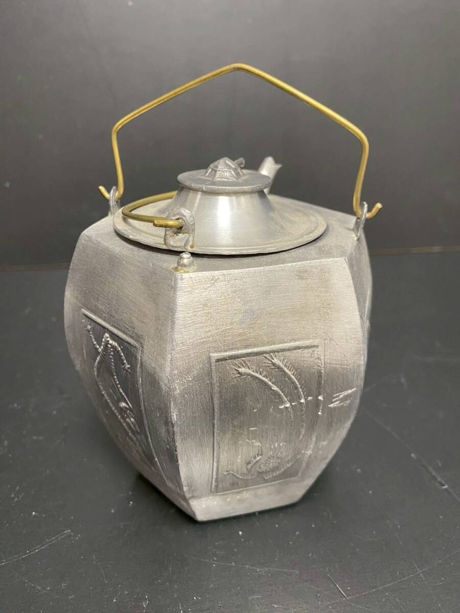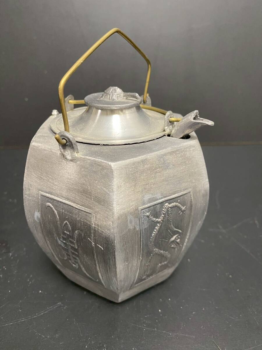 | ★a-236 温酒壺 龍鳳凰文六角酒器 錫製 亀掴み 酒器 レトロ 骨董 コレクション 錫製 H:約13㎝ | ||