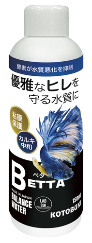 こちらの商品の発送方法は定形外郵便となります。定形外郵便のお届けは、通常2~5日程度要します。お急ぎの方は宅配便を選択ください。定形外郵便は、追跡番号なし、破損補償なし、代引き不可、時間指定なし(ポスト投函)となります。止水飼育で優雅なヒレを守るカルキ抜きです■小さな水槽でも飼育可能なベタ。少ない水容量とベタの特性を考えた配合バランス。■バイオ活性水が酵素の働きにより、残餌、アンモニアの分解を促進するので、フィルター設置の無いベタの飼育水で特に有効。また、酵素はベタの腸内環境も維持する為、健康なベタ本来の体色を引き出す。■ビタミン配合でベタの粘膜生成や抵抗力を維持。更に海藻由来エキスが表皮、ヒレの粘膜を保護し美しく保つ。■水道水に含まれるカルキ、残留塩素を瞬間除去。成分:チオ硫酸ナトリウム/バイオ活性水/海藻由来エキス/ビタミン原産国:日本●この商品のボトルにはバイオマス原料を使用しています。