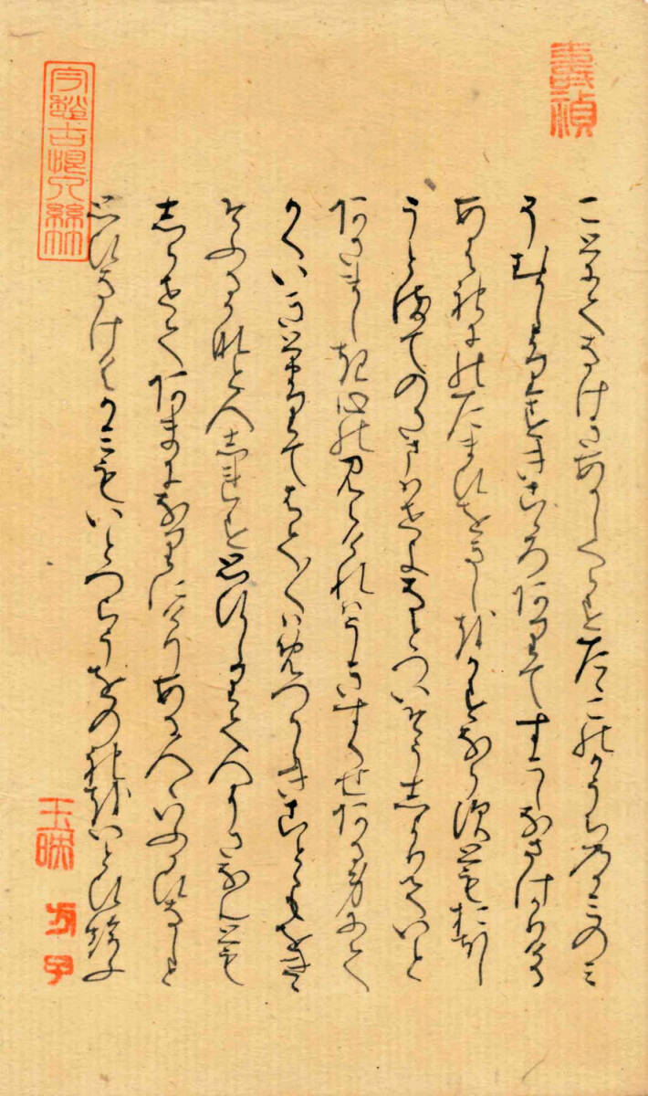 「関屋(せきや)」原本自筆上部には、「今愁古恨入絲竹」《今の愁(うれ)い古(いにしえ)の恨み糸竹(しちく)に入る》という漢文の篆書印が押捺されている。