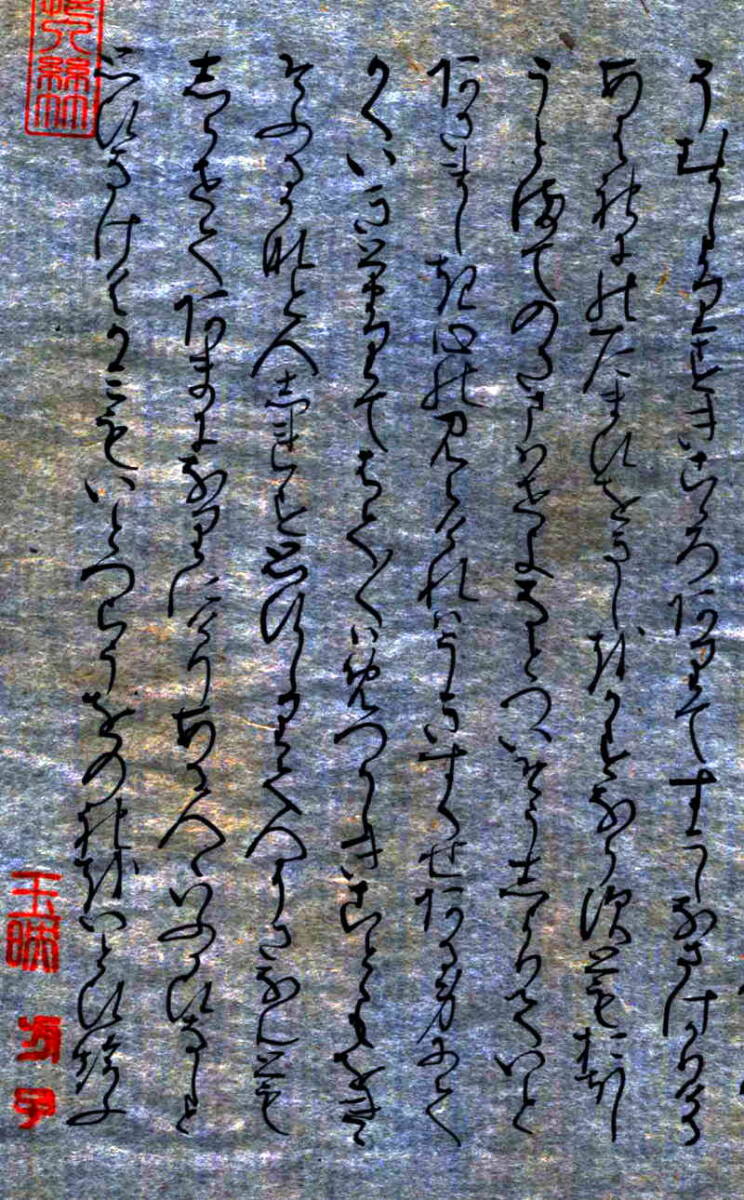 「関屋(せきや)」原本自筆上部には、「今愁古恨入絲竹」《今の愁(うれ)い古(いにしえ)の恨み糸竹(しちく)に入る》という漢文の篆書印が押捺されている。言葉の意味は、「今人の愁い、古人の悲しみ、楽の音に籠(こも)る」という内容です。紫式部がこの原詩に親しんでいたことがわかる。