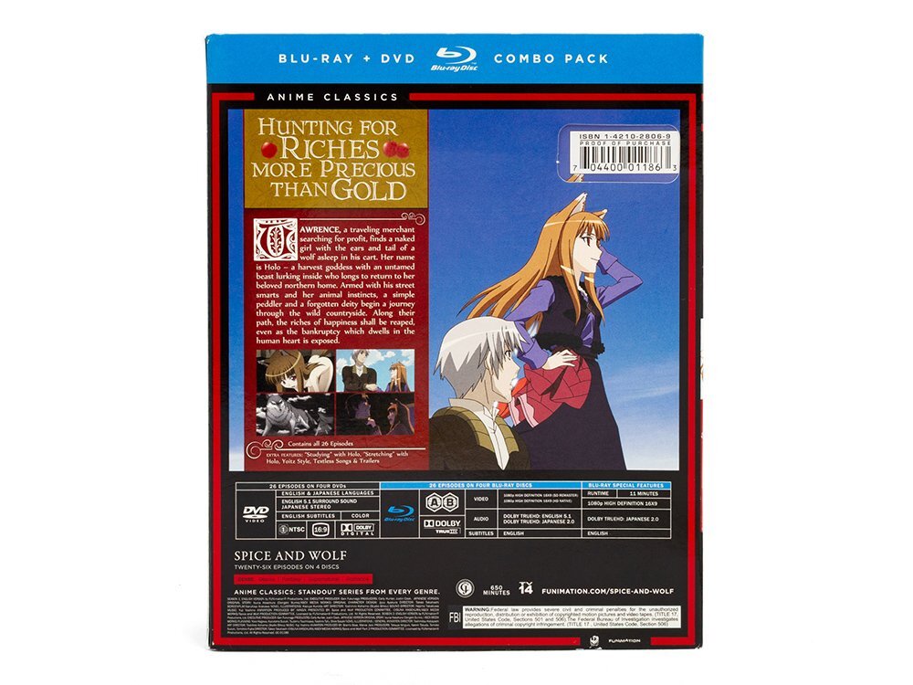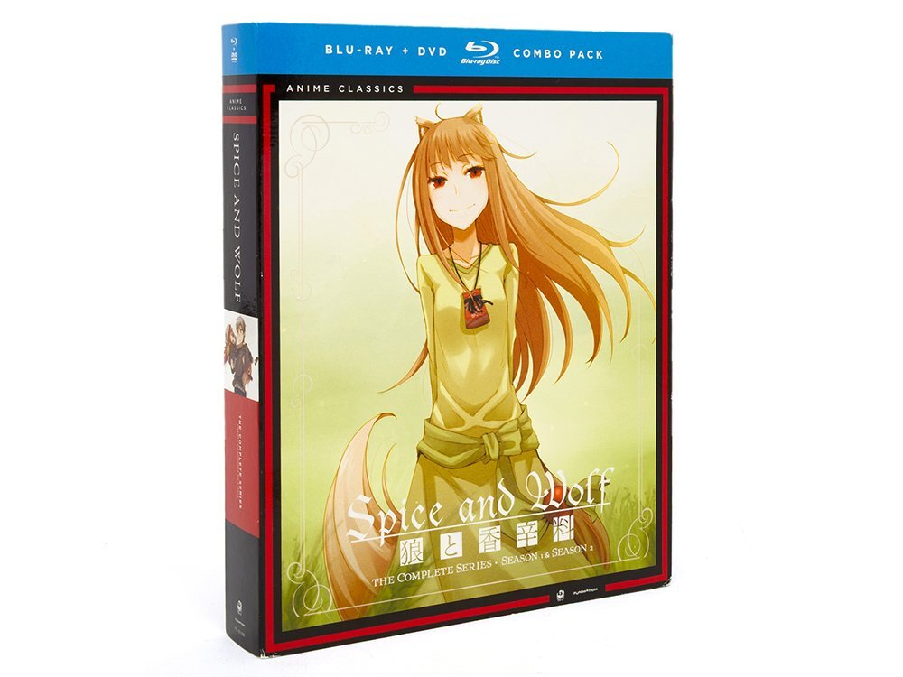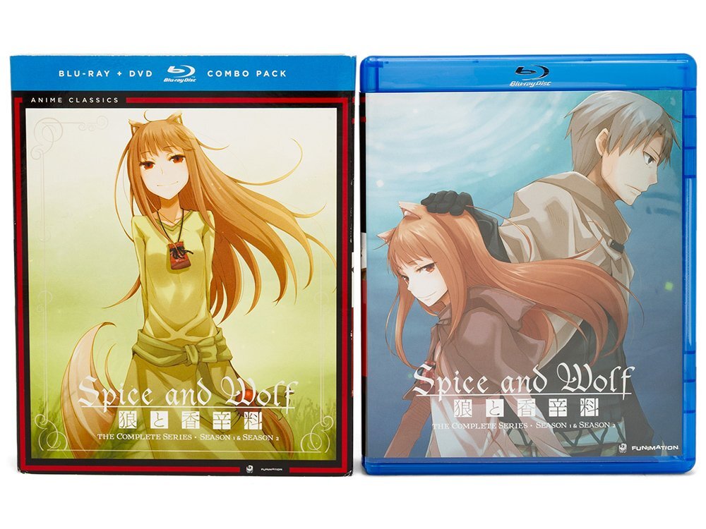 支倉凍砂が2006年に発表したライトノベルを原作にしたアニメとして、2008年にシーズン1と2009年にシーズン2が放送された「狼と香辛料」の第1~2シーズン全25話と、2009年に販売されたビジュアルノベルの特典として付属したOVA 1話を収録して、Funimationから2014年にリリースされたブルーレイとDVDのコンボボックスです。 |