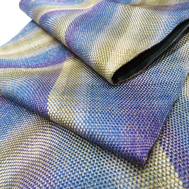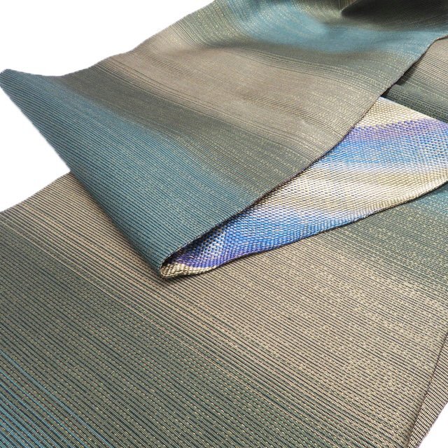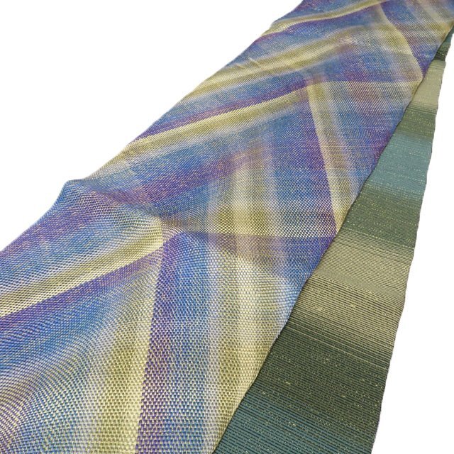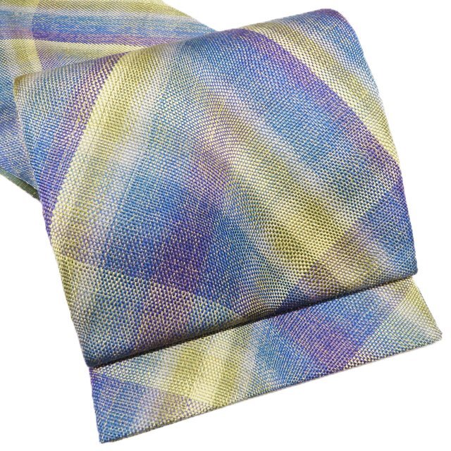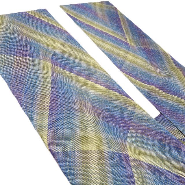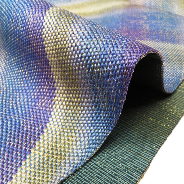 サイズ 440.5cm x 30.5cm 素材 正絹 商品ランク B ●お色 青系色 紫系色 黄系色 多色 金通し 『組帯』は、古来より受け継がれる、日本の組紐の技術から生まれた帯です。 一般的な織物は経糸と緯糸が90度の角度で交差しますが、組物は2本の糸が縦方向に対して斜めに組んでいきます。 しなやかで体のカーブに沿ってしっかり締めやすい帯です。 美しい組紐の技術と軽やかな織上がりを、是非お手元にてお楽しみくださいませ。 少し金糸の緩みがございますが、使用の感少ない美しいお品物です。 写真に写っている帯のみの販売で、小物等の付属品はついておりません。 一部商品は実店舗・他サイトでも並行して販売しておりますので売り切れの際はご了承ください。 その他多数販売中 ku- | ||||||
