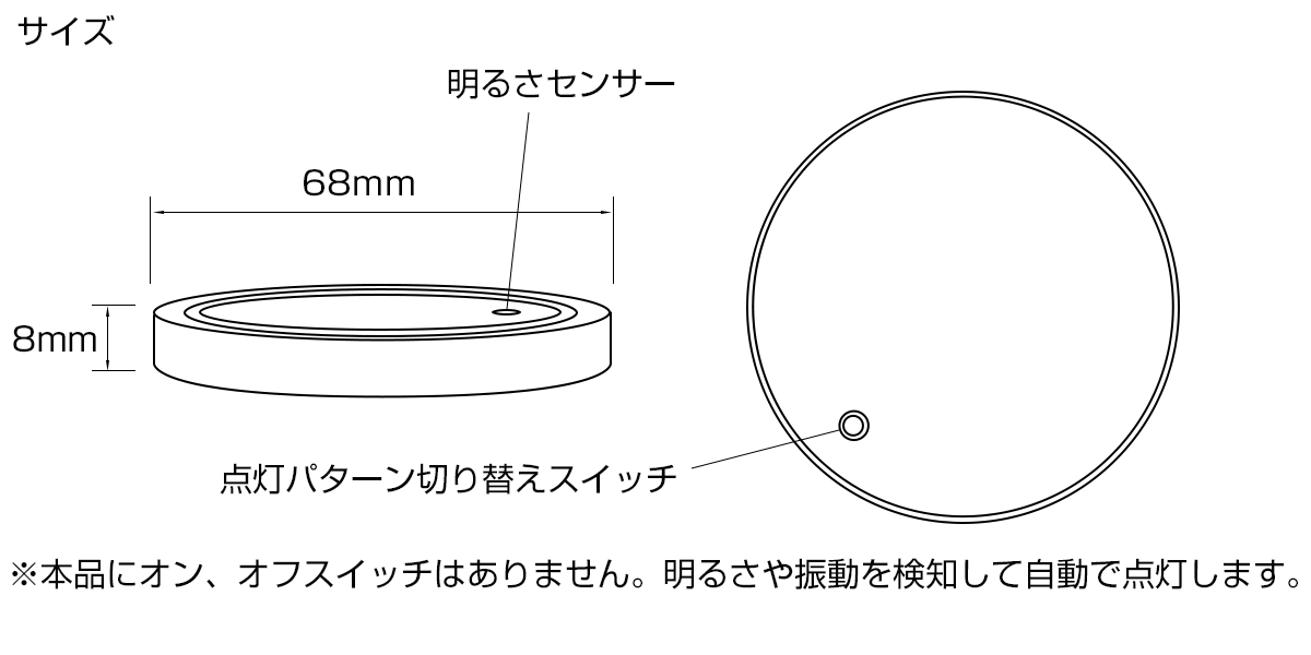 ドリンクホルダーに置くだけで、簡単にイルミネーションを楽しめるアクリル製のコースターです。 裏側のスイッチを押すたびに発光パターンやカラーが変更できるので自分好みの車内空間を設定可能。 光や振動を検知して発光するオート式で、日中や駐車時は消灯し、電池の消耗を最小限に抑えます。 | ■ RGB イルミネーションプレート ■ USB充電式 ■ セット内容 プレート×2 充電ケーブル×1 ■ サイズ:直径68mm×厚さ8mm ■ 発光パターン、カラー変更可能 本品にオン、オフのスイッチはありません。周囲の明るさ、振動を検知して自動で点灯します。 スマホやタブレット等の急速充電器は使用しないでください。電池の破損や本体の故障に繋がります。 | |