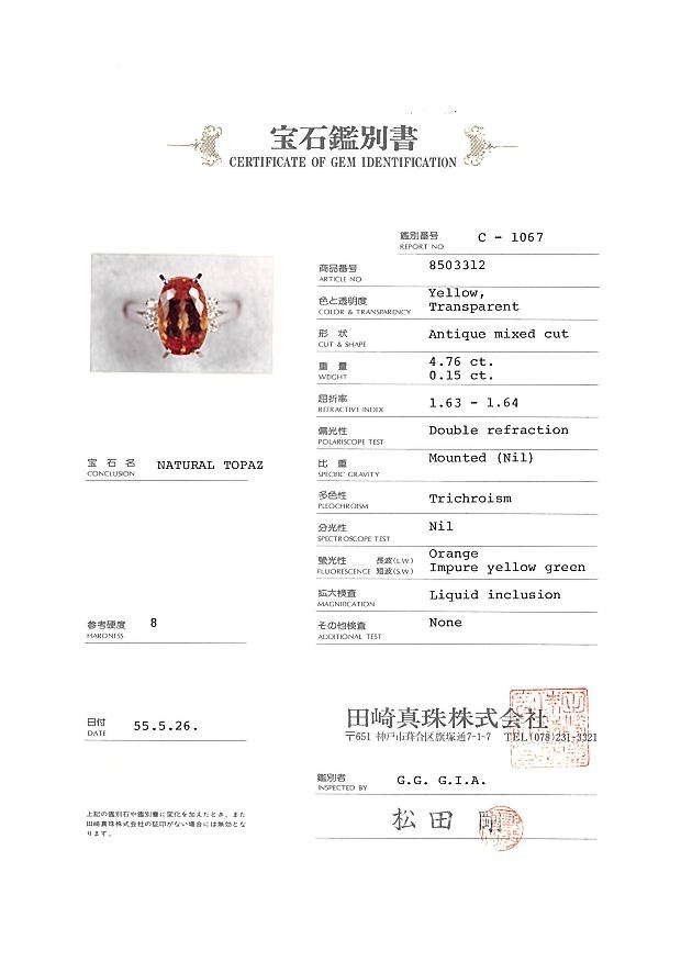 色濃く妖艶なシェリー酒を想像させるタサキ厳選のインペリアルトパーズは極上の透明感と共に美しいテリを披露する素晴らしい1石。両脇に添えられた上質メレダイヤと共にお手元を優雅な雰囲気で照らしてくれるリングです。 |