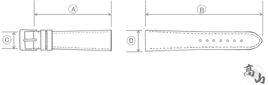 サイズ:A(12時側):約75mm / B(6時側):約135mm / C(尾錠幅):18mm / D(ラグ幅):20mm