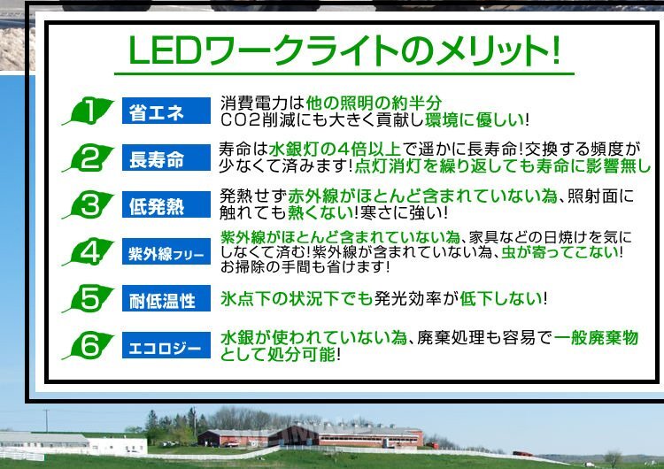 | 明るくコンパクトな汎用LED作業灯(ワークライト)です。 漁船・漁業、農業機械、建設機械、工程機械、トラック、デッキライト等に、災害時の備えに、工事現場に様々な場面で活躍! 防水性能IP67だから車両搭載や屋外使用も可能!! 取付ステーで上下のライト角度調整可能!! バッテリーのプラスとマイナスの接続だけですぐに使用出来ます。 ◎主な用途 ・トラックの荷台用の照明 ・フォークリフトのライト ・除雪車のライト ・海苔漁の常夜灯 ・漁業の集魚灯 ・キャンプ等では車などのバッテリーに繋いで使用可能 ■商品仕様 LEDパワー:18W 動作電圧:10V〜30V 色温度:6000K 防水等級:IP67 LED:3w×6pcs 18Wの高出力LED 照射角:広角タイプ(光角度:60度) 長寿命(約):30000時間 本体材質:アルミ合金 レンズ材質:PMMA 配線の長さ(約):430mm サイズ(約):160×46×55mm(取付金具除く) 重量(約):410g ■注意事項 本製品はDC電源(直流電源)仕様となっております。AC電源(交流電源)では絶対に使用しないでください。