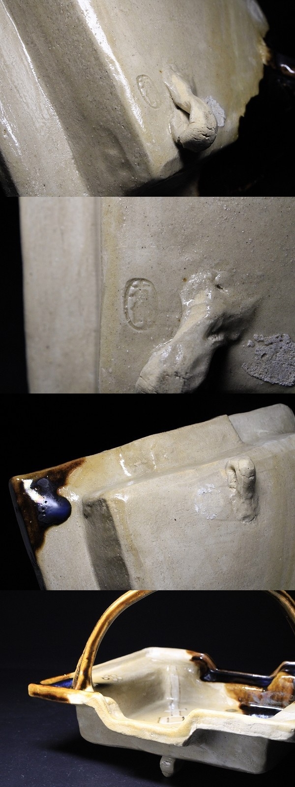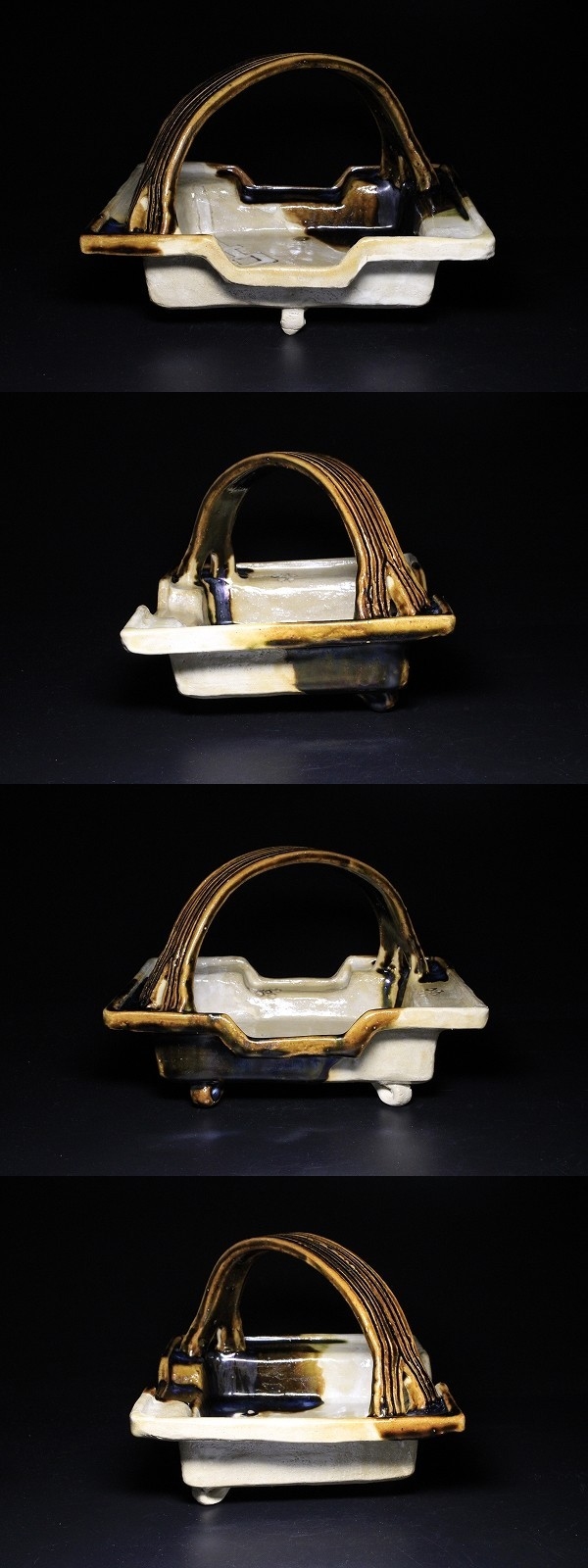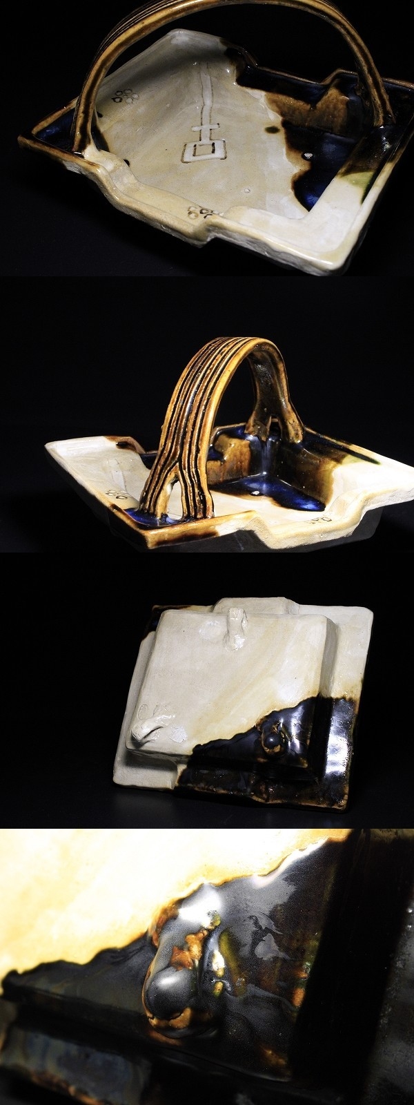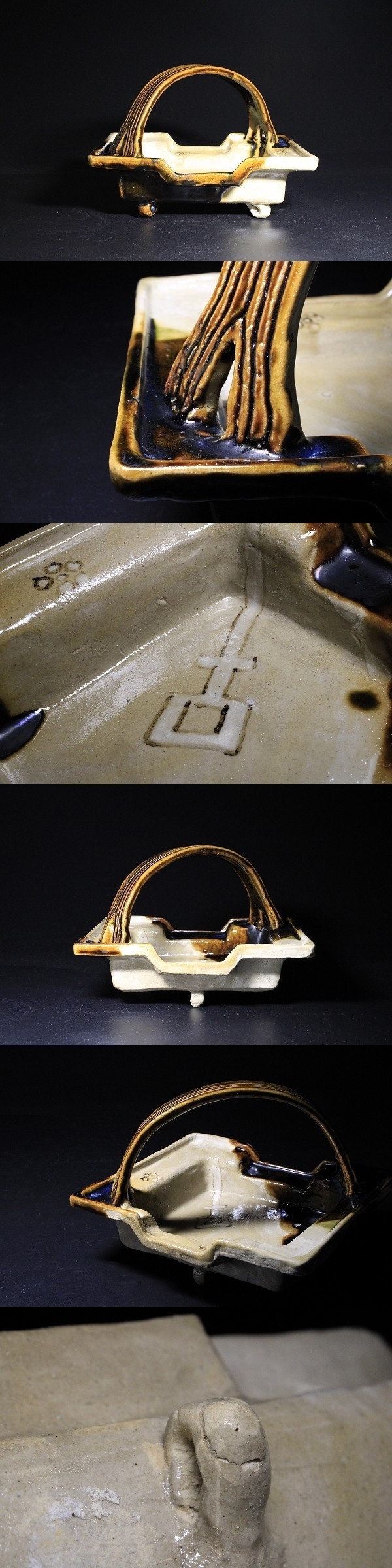 商品説明 | 状態 : 底面足の先に窯キズが御座います。 修繕してあるかどうかは判然としませんでした。 製品特性上、窯キズは数か所見られます。 気にはならないとは思いますが、念の為掲載させていただきました。 萬古焼の名工 森有節による織部手鉢です。 造りは非常にしっかりとしており、三足の足がとても安定しています。 釉薬の配置や絵付け等々、名工と謳われる技が各所に見られます。 ファンには堪らない逸品です。 中々お目に掛かれないと思いますので、この機会に是非如何でしょうか。 径 19.6cm×23.2cm 寸法 : 高さ 16.1cm 箱 : 塗箱 元箱が破損したのか、塗箱に元あったとみられる古い張り紙が張られています。 |