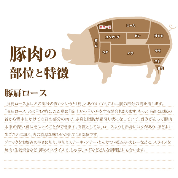 ホエイ豚:牛乳からチーズを作る時に副産物としてできる"ホエイ(乳清)"を飲ませて育てた豚。風味のよさ、やわらかさが特徴です。 豚肩ロースとは豚の首から背中にかけての肩の部分の肉で、赤身と脂肪が霜降り状になっていて、旨みがあって豚肉本来の深い風味を味わうことができます。肉質としては、ロースよりも赤身にコクがあり、ほどよい歯ごたえに加え、肉の濃厚な味わいが出てくる部位です。 ※梱包時の真空処理の過程で一時的に肉の赤みが変色致しますが、真空パック開封後15分ほど経過後には元の赤みを取り戻しますのでご安心下さいませ。 |