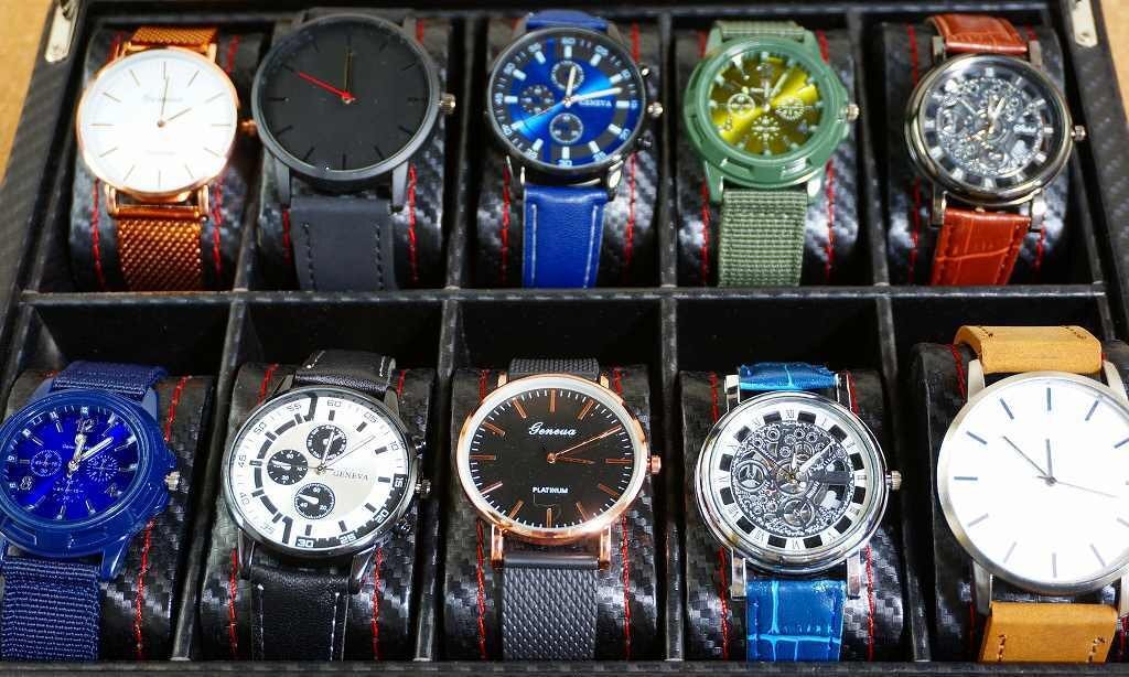 新品 まとめて 腕時計 豪華10本セット 新品 腕時計 まとめて10本セットです。 写真の腕時計 計 10本(クォーツ式)がお譲りする商品そのものになります。 腕時計の動作は確認できております。 [ 時計のセットの仕方 ] ・右側つまみを引っ張ると時計の針が回ります。 ・つまみを押し込むと針がロック状態になります。 ※輸入品につき軽微な傷等がある場合がございます。 ※商品使用等に関してのサポートはできません。 ※腕時計が収まっている写真中のケースは商品には含まれません。 当店の他の出品商品との同梱料は下記のとおり落札1点につき200円です。 |