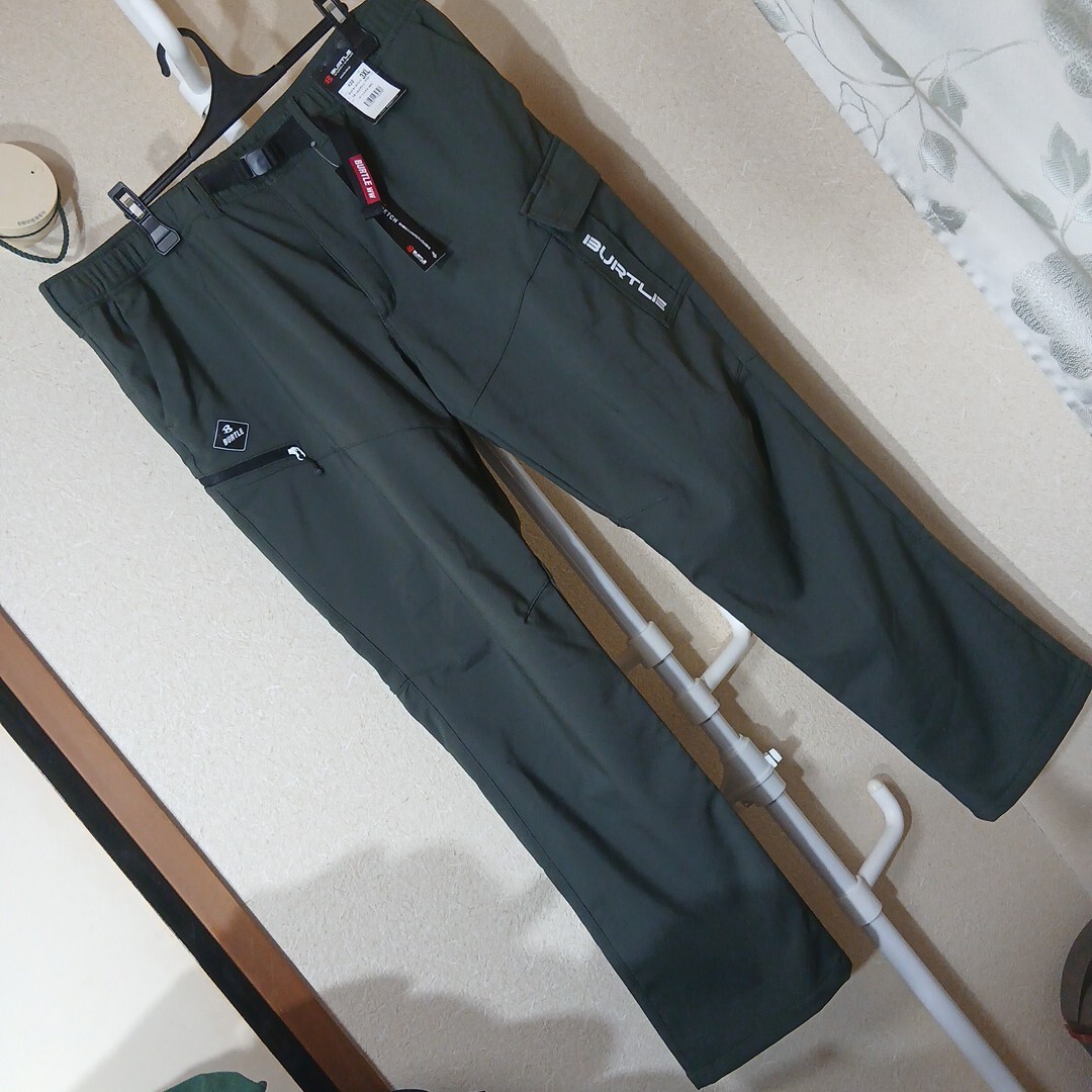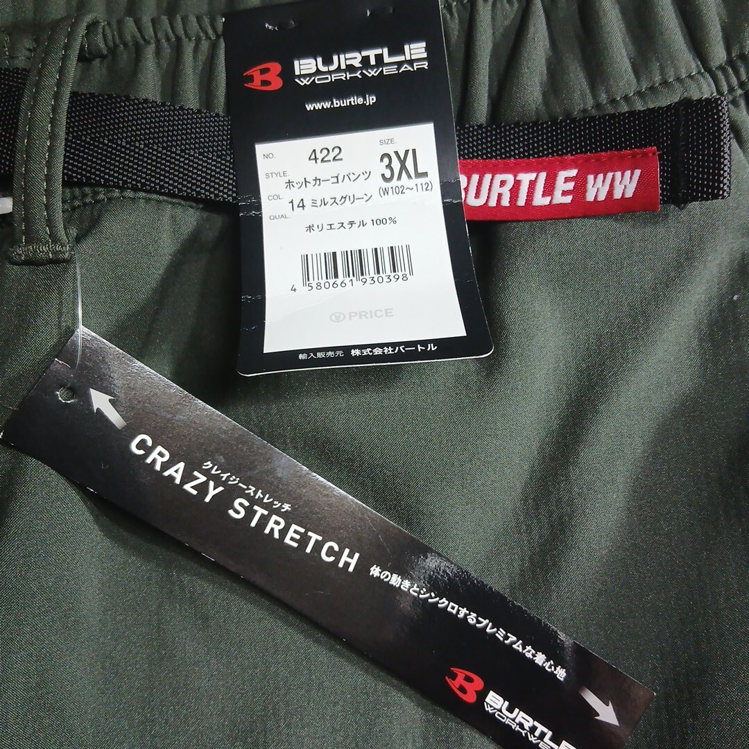 バートルのホットカーゴパンツです。サイズは3XLで、ウエスト102~112センチです。実寸でおおよそ股下80センチ、裾幅21,5センチです。素材は、ポリエステル100%です。色は、ミルスグリーンです。未使用ですが自宅保管品です。