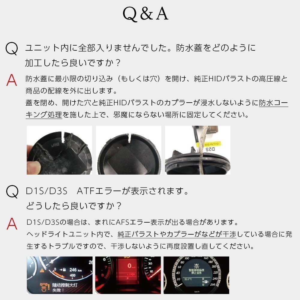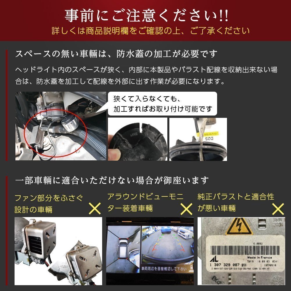 | ●ご購入にあたって ※ご注文後の商品の変更・キャンセルは基本的に出来ませんので、ご注意下さい。 ・商品は通常ストックがございますが、複数店舗で運営しているため、人気商品や品薄商品に注文が重なった場合、稀に在庫切れとなる場合がございます。 ・商品は海外生産の為、若干のスレや汚れがある場合がございます。また、製造時期やロットにより、外観が一部異なる場合がございます。使用上には問題ございませんので、ご理解の上でご購入をお願いいたします。 ・お車の適合に関しては車種別適合表でご確認ください。適合表に記載がない場合は、専門業者又はディーラーでご確認をお願いいたします。 (適合表は車種別のバルブの形状を記載しているのものであり、装着の可否を示したものではございません。) ・バルブ形状が一致していても、スペース不足、レンズ内の距離等により設置不可となる場合がありますので、ご購入の前に必ず現車にてご確認ください。 ※一部の車種、年式、グレードによっては、加工や部品(バルブ固定アダプタ等)が必要な場合がございます。 ※適合表に記載があっても特別仕様車等でバルブタイプが異なる場合がございます。ご購入前に必ず取り付ける車両でバルブタイプをご確認ください。 ・最終的なお取り付けの可否につきましては、お客様ご自身でご判断いただきますようお願い致します。 ・初期不良の確認の為に、取付加工を行う前に、必ず点灯チェックを行ってください。 ・不具合発生時に装着前の状態に戻せるよう、装着の際に外された部品は必ず保管しておいてください。 ・如何なる理由があろうとも脱着作業に掛かった工賃やその他諸費用はご負担致しかねます。予めご了承ください。 ●車検対応について ・4300K、6000Kは車検対応商品ですが(HID H4 Loは車検不対応)、必ず検査に合格することを保証するものではありません。ヘッドライトの形状によりカットラインがしっかり出ない場合や、陸運局の判断により不適合と判断される場合もありますので車検の際は純正バルブに戻して検査されることをお勧めいたします。 上記理由より、ヘッドライトをHIDキットに換装された際は、必ず純正バルブを保管しておくよう、お願いいたします。 ●HIDに関して ・お車の適合に関しては車種別適合表でご確認ください。適合表に記載がない場合は、専門業者又はディーラーでご確認をお願いいたします。 ※一部の車種、年式、グレードによっては、加工や部品(バルブ固定アダプタ等)が必要な場合がございます。 ※適合表に記載があっても特別仕様車等でバルブタイプが異なる場合がございます。ご購入前に必ず取り付ける車両でバルブタイプをご確認ください。 ・HIDの特性により新品バルブは点灯直後にチラつく場合がありますが故障ではありません。新品から24時間程度で点灯させることで安定いたします。 ・バルブのガラス部分を直接手で触れたり、油分のついた軍手等で触れると、寿命が短くなる恐れがあり、最悪の場合はバルブが破裂する危険性があります。 ガラス部分には絶対に触れないで下さい。万が一、油分が付着した場合は、アルコールで十分に除去した上でご使用下さい。(※取扱い方法が原因の故障は保証対象外となりますのでご注意ください) ・一部車種では玉切れ警告灯が点灯する場合やハイビームインジケーターが使用できない場合があります。 (ハイビームインジケータ不点灯防止ユニットで解消する場合がございますのでお試しください) ・一部車種では電圧の不安定が原因で点灯不良を起こす場合があります。 (別売の電源安定性強化リレーをご購入下さい) ・オートライト機能付きの一部車種ではオートライトが正常に動作しなくなる場合があります。 ・アイドリングストップ車にも対応していますが、電力不足によりチラツキや消灯の症状が出る場合があります。 (別売の電源安定性強化リレーをご購入下さい) ・H8/H9/H11/H16は兼用商品となっておりますが、一部加工が必要な場合もあります。 ・H3をH3aに、またはH3CをH3dに使用する際は、バルブの台座爪部分に加工が必要になります。 ・車両の電圧および極性について、シングルバーナー及びH4Lの場合、車両によっては片側が点灯しない、または両方点灯しない等の現象がある場合には車両側から供給される電源の極性(+/-)が逆になっている場合があります。 その場合には製品に必要な電源電圧および極性の向きに合った電源を供給する事が必要です。間違った電圧や極性では製品は作動しません。バラストへの12V入力ソケットを180度反対に差し込むと点灯致します。製品の不良ではありませんのでご安心ください。 ・初期不良の確認の為に、取付加工を行う前に、必ず点灯チェックを行ってください。 ・取り付け後点灯しない場合は、接触不良等が考えられますので、しっかり装着されているかをご確認ください。それでも点灯しない場合は左右を入れ替えて点灯チェックをしてくだ