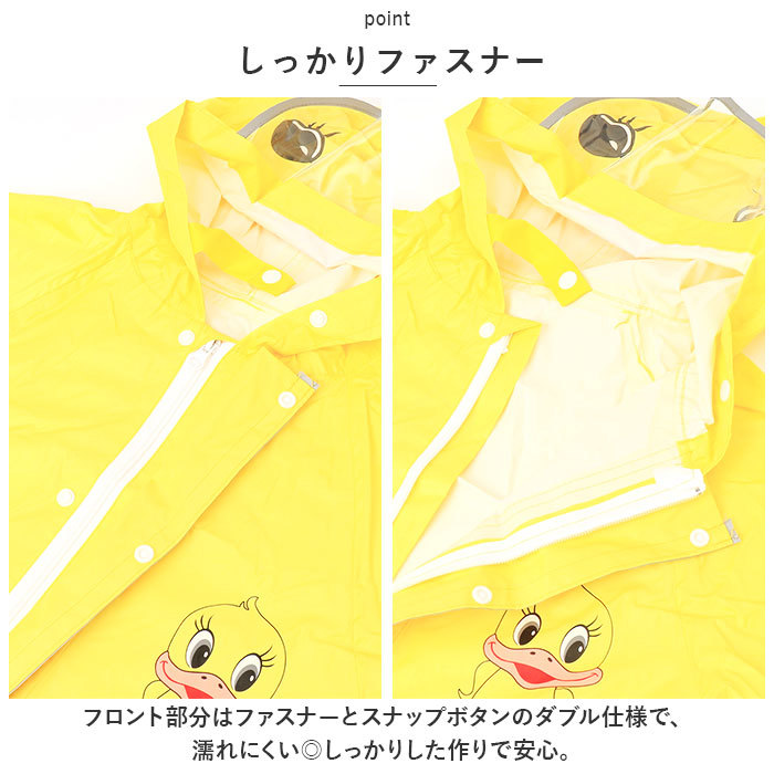 | 商品説明 | ・・カバーオール仕様で全身をすっぽり覆う☆キュートなレインコートが登場♪ ・【カバーオール仕様】 ・頭から足首まですっぽり覆う、カバーオール仕様。しっかり全身をカバーしてくれるから安心。お洋服を雨から守る☆ ・【クリアバイザー】 ・視界を遮らないクリアバイザーつき!フードには、可愛いお顔のデザイン。お子様ならではのキュートな姿にほっこり♪ ・【しっかりファスナー】 ・フロント部分はファスナーとスナップボタンのダブル仕様で、濡れにくい◎しっかりした作りで安心。 ・【撥水加工】 ・水をはじきやすい撥水加工を施した生地。雨のしずくからお子さまの身体をしっかりガード!※完全防水仕様ではありません。 ・【袖と裾はゴム仕様】 ・めくれ上がりと水の侵入を防ぐ、ゴム仕様の袖と裾口。手首、足首でキチンととまるので動きやすさも◎ ・【サイズ絞り】 ・腰部分には、サイズを絞れるスナップボタンを搭載。ボディのサイズに合わせて微調整できる。 ・【ポケットつき】 ・鍵やタオルなどの小物を入れられる、便利なポケットつき! ・【選べるデザイン】 ・雨の日でも目立つ、元気なカラーとポップでキュートなデザイン。お気に入りをチョイス! |