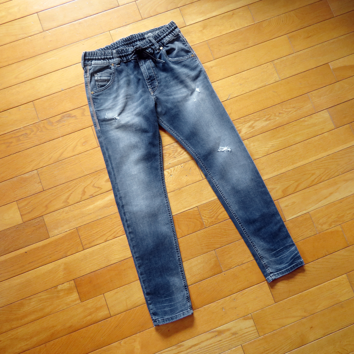 Diesel のジョグスウェット ディーゼル ジョグスウェット デニム Krailey-ne 23インチです。 ディーゼルの人気のジョグデニム(スウェットデニム)のモデルは、お好みのサイズ感によって カジュアルからきれいめにも使える万能なボーイフレンド系美シルエットデニム「Krailey-ne」です。 ディーゼルらしい、本当に使い込んだような色合いで、ビンテージ感がでで良い雰囲気になっています。 やりすぎない程度の適度なダメージ加工があり、雰囲気抜群のデニムになっています。 ウエストのドローコードもリラックス感があり、適度なリラックス感がとってもおしゃれです^^ お色はインディゴブルーです。 右側写真は、同じモデルです。とっても可愛いです。シルエット着こなしなど参考にしてみてください。 ジョグジーンズは何本かもっていますが、スウェットのよう生地で とっても柔らかく履きやすいので、カジュアル通勤、公園に、子供の運動会、 家事や自転車、車の運転や旅行などにも大変重宝しますよ。もちろん自宅でも履いていてもとっても楽です。 一回履くと病みつきです。 おすすめです!いかがでしょうか^^ ----------------------------------------- 【コンディション】 多少の使用感はありますが、着用回数はわずかで、大きなダメージや目立つ汚れはありません。 まずまずきれいかと思います。十分着用していただけます。 ★凄くリアルな使い込んだような色合いとあたり感(ヴィンテージ加工)、 ダメージはすべて元々の加工です。 --------------------------------------------- 【モデル】 Krailey-Ne 0683R 【表記】 サイズ W23 【実寸】 平置き ウエスト 34.5cm×2(69cm)(平置き後ろ直線測定) (ウエストはドローコード、ゴム仕様になっていて多少伸びるようになっています。) 股上 25cm 股下 70cm 裾幅 13.5cm もも幅 21.5cm (股下付け根より10cm程下を水平に計測) 前後程度になります。※平置き、素人採寸になりますので、多少の誤差はお許し下さい。 ---------------------------------------------- 【素材】 綿90% ポリエステル8% ポリウレタン2% 【色】 インディゴブルー 【フロント】 ジッパー ドローコード 【USED品】 ◆ 他にもいろいろデニムなど出品していますので、よかったら見ていってください。 ◆ もちろん同梱もできますので、お気軽にご質問ください。 ----------------------------------------------- ◆ 気持ちの良いお取引を目指していますので、ご質問は事前にお気軽にどうぞ。 終了直前だとお答えできない場合があります。どうぞよろしくお願い致します。 | ||||
