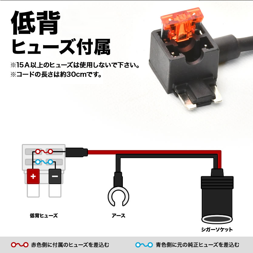 | 内容 | シガーソケット付低背電源取り出しヒューズ、10Aヒューズ | 入力電圧 | 12V/24V兼用 |