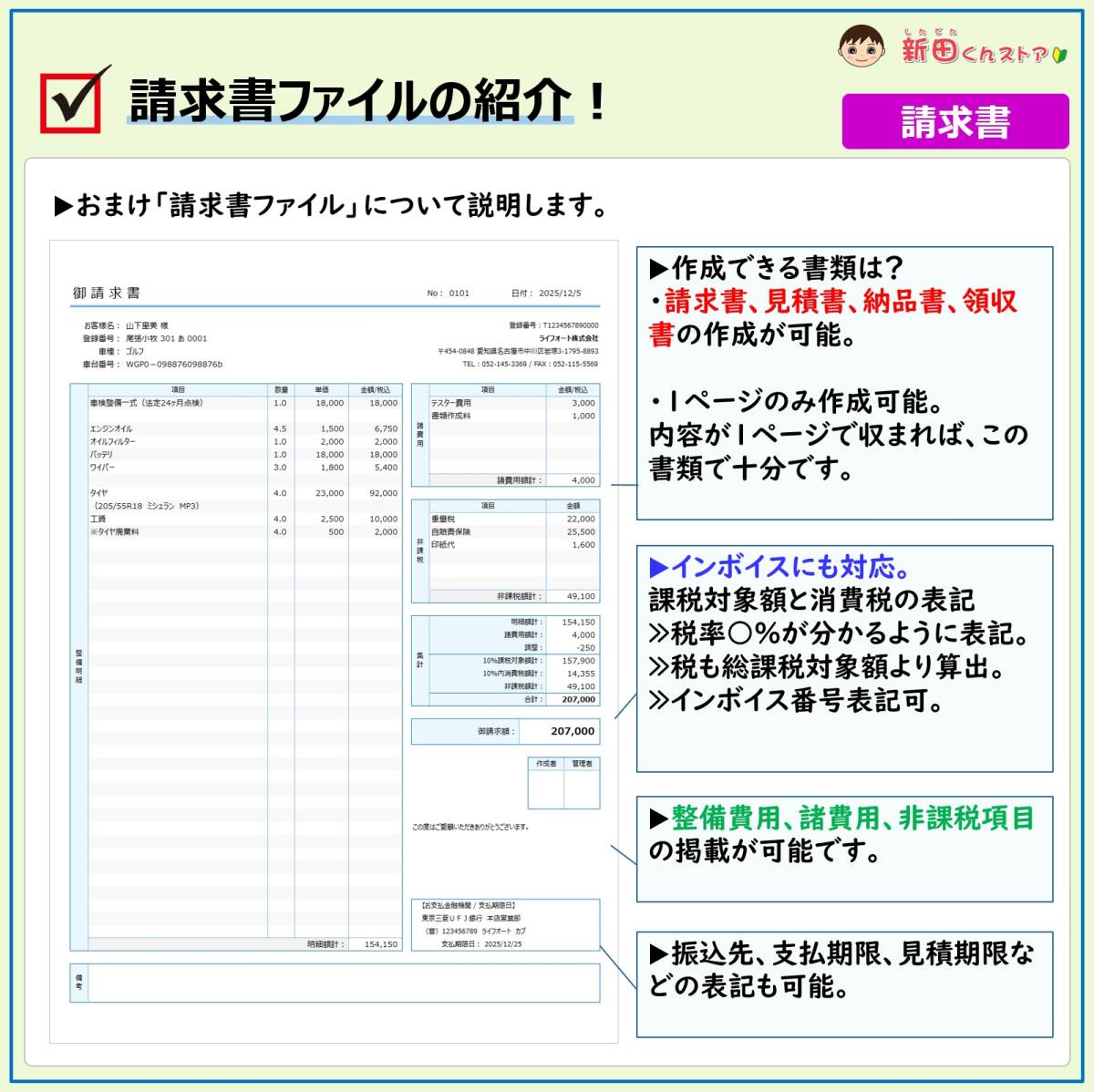 ■商品概要 ・自動車業務系・前払金「預り書」作成ファイルです。 ・車検などで費用の一部を前払い頂いた時にご利用下さい。 ・用途に合わせ「預り領収書」と「預り書」の使い分けが可能。 ・書類の上段が「御社控え」下段を「お客様用」として利用。 ・インボイス制度(登録番号)の掲載も可能です。 ■1ページタイプ請求書 ・請求書、見積書、納品書の作成が可能です。 ・1ページで収まる内容で利用可能。 ・通常税率、非課税(軽減税率非対応)商品に利用できます。 ※掲載件数が多くなければ、この請求書で十分です。 |