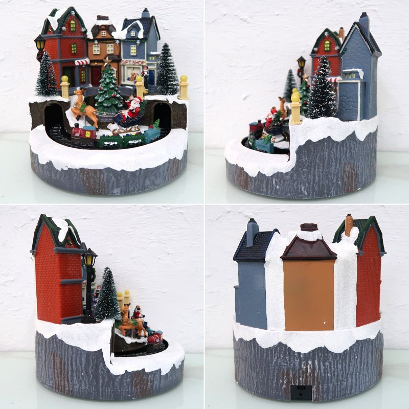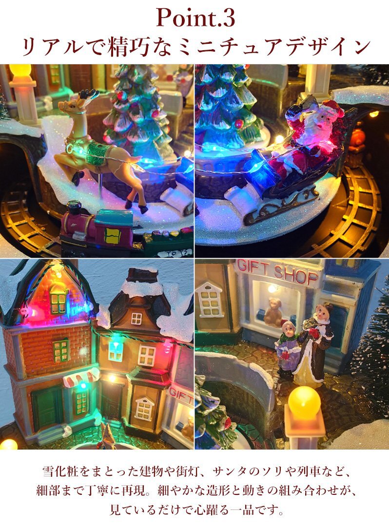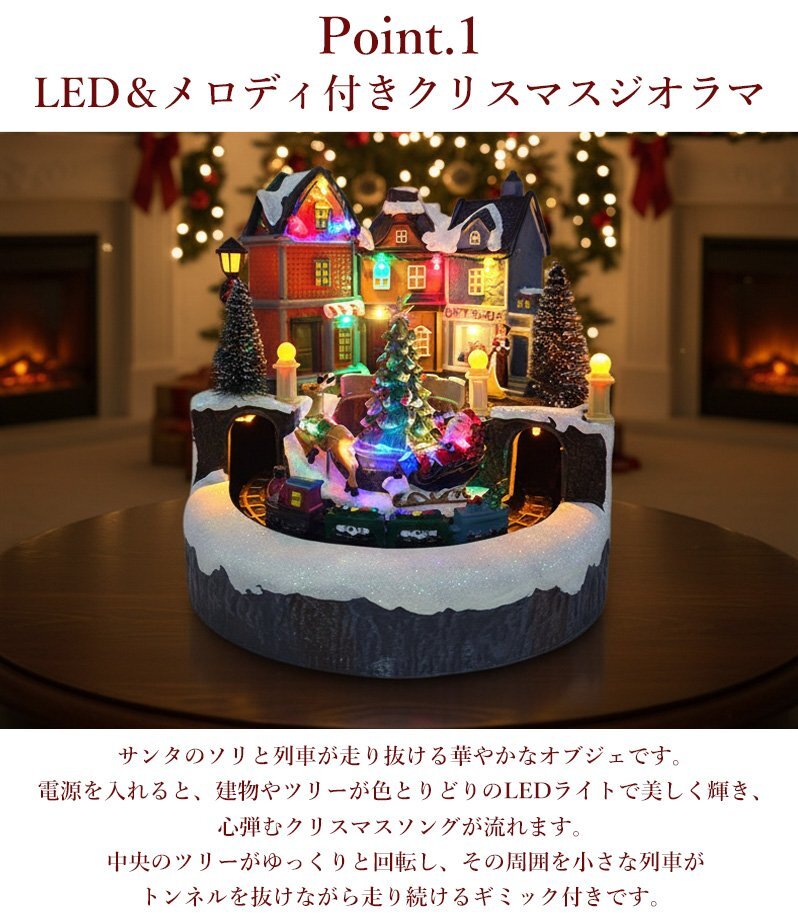 ![]() 光と音で楽しむミニチュアの街「クリスマスタウン・トレイン」オブジェ 幻想的なクリスマスタウンを舞台に、サンタのソリと列車が走り抜ける華やかなオブジェです。 電源を入れると、建物やツリーが色とりどりのLEDライトで美しく輝き、心弾むクリスマスソングが流れます。 中央のツリーがゆっくりと回転し、その周囲を小さな列車がトンネルを抜けながら走り続けるギミック付き。 動きと光が融合した立体的な演出で、まるで絵本の中の冬の街を見ているような気分に。 雪化粧をまとった建物や街灯、サンタのソリや列車など、細部まで丁寧に再現。 ライトアップ時には奥行きのある陰影が浮かび上がり、昼間と夜で異なる表情を楽しめます。 インテリアとしてはもちろん、玄関やショップディスプレイにも映える存在感です。 クリスマスの飾りつけや、インテリアのアクセントとしてもおすすめ。 眺めるたびに楽しい気分にさせてくれる、遊び心いっぱいのオブジェです。 クリスマスのインテリアや冬のディスプレイにぴったりな、心弾むミニチュアオブジェです。 給電方法は2つ、付属のUSBコードで使用する他、 単三電池3本でコードレスとしての使用も可能! 精巧に作られている為、ライトを点灯させずに 単体でオブジェとして使用しても存在感抜群です! ギフトなどにもおすすめです! ●動作パターン● ・未点灯 ・LED点灯(音楽なし) ・LED点灯(音楽あり) ※乾電池、USB出力用のアダプターは付属しておりません。 点灯時の様子は動画でご覧くださいませ。 動画はこちら ↓↓↓↓↓↓↓↓↓↓↓↓↓ こちらをクリック! 【商品詳細】 サイズ(約): 横幅23cm×高さ23cm×奥行23cm コード長さ(約):100cm 重量(約):800g 素材:プラスチック・樹脂 【給電方法】 単三電池×3/USBコード |