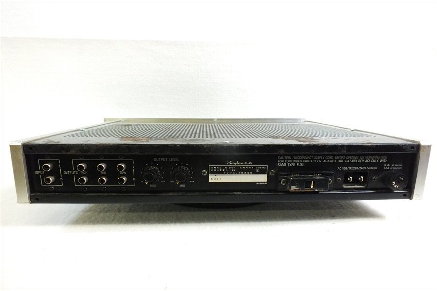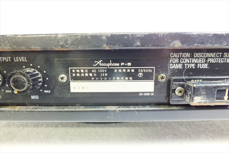 | ◆商品◆ メーカー---------Accuphase アキュフェーズ 型式-------------F-5 500Hz 7000Hz 付属品-----------画像に写っているものがすべてになります。 ◆外装ランク◆ 【 C 】 ◆状態◆ 中古品の為キズや汚れなどの使用感はご容赦ください。 1 対応電源線欠品 外装にキズ汚れ有り 天板に錆目立つ 設備がないため、通電や動作については一切不明です。その為、返品保証制度の対象外商品となります。 現状品での出品となります。 【重要】配送送料と送料に送料が0円と表示される場合がございますが、出品画面に記載の送料が落札後にご精算されます。 | |||||||||||||||||