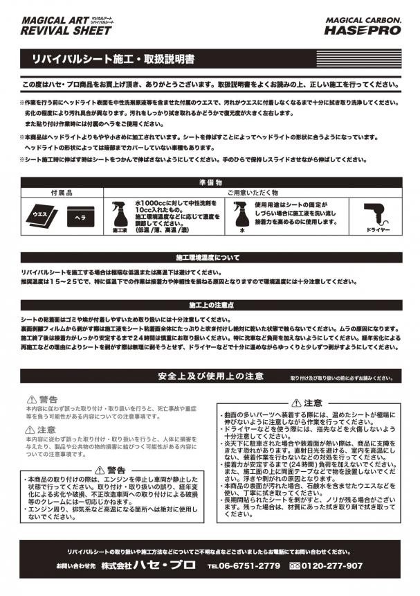 ![]() 車種別専用プレカットシリーズ 車種別専用プレカットは、マジカルアートリバイバルシートを車種に合わせて専用カットしたプレカットシリーズになります。 貼り方手順は、下記取り扱い説明書に準じてDIY可能です。 ![]() 取扱い説明書 ![]() 商品説明 1 「マジカルアート リバイバルシート」は、ポリカーボネート製ヘッドライトの経年による黄変劣化を、ケミカル用品で研磨する従来品 とは違い、シートを貼り付けることで透明感を復元(リバイバル)させることに成功した、特許取得商品です。 磨かない、削らない逆転の発想で生まれた今までにない全く新しいヘッドライト補修・保護シートです。 ヘッドライトの黄変劣化は、外観上もさることながら光量低下による走行上の安全性をも損ね、光度不足や光軸調整ができず、 車検不適用の影響も出て来ております。 従来品(ヘッドライト用クリーニング剤)は、表面研磨により、一時期的に透明感が甦るも、表面保護膜のコーティングを削ることで、 その保持力の寿命が急激に低下していくことにより、黄変劣化の頻度が早まり、結果ヘッドライト自体を交換せざるを得ない事例が 後を絶ちません。 マジカルアートリバイバルシートは、そんな悩みを解消する画期的な商品です! ?復元する透明感 紫外線直射や経時変化により、ヘッドライト表面のくもりや黄ばみの原因となるクラック現象に対し、本シート(特許素材)を表面に 貼り付けすることにより、凹部に特殊粘着層が含浸し透明度が見違えるように甦ります。 ※車検の保安基準に基づく、光量試験での実測値にて検証済み、透明度の復元による明らかな数値アップを確認しております。 ?高い耐候性 紫外線による黄変、白濁を5年間防ぎます。 ※促進耐候試験/サンシャインウェザーメーターCX75 照射1500時間(実暴5年相当) ※保証値ではありません。 ?優れた柔軟性と強い保護力 薄さ170ミクロンで柔軟性に優れ緩やかな三次曲面にもしっかり密着します。 走行時の飛び石や砂塵などによる外傷から保護します。 ?新車時からの施工装着により、長期間ヘッドライトを保護。 ![]() 商品説明 2 マジカルアート リバイバルシートの復元原理 (1)紫外線等により劣化し、細かいクラックが入った表面に、リバイバルシートを貼り付けます。 (2)ヘッドライト表面のクラック部に、リバイバルシートの特殊加工(特許製法)した粘着層が徐々に浸透していきます。 (3)粘着層が隙間なく浸透することにより、黄ばみ等も消え、透明感が蘇り、キレイにリバイバル(復元)します。 ![]() マジカルアート リバイバルシートプロモーションムービーはこちら |