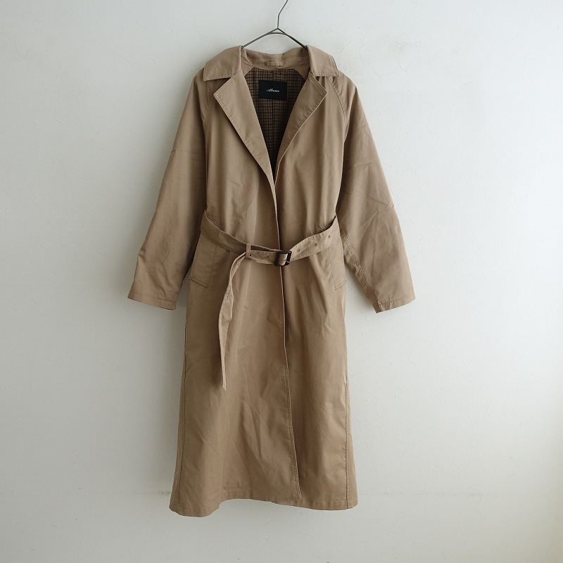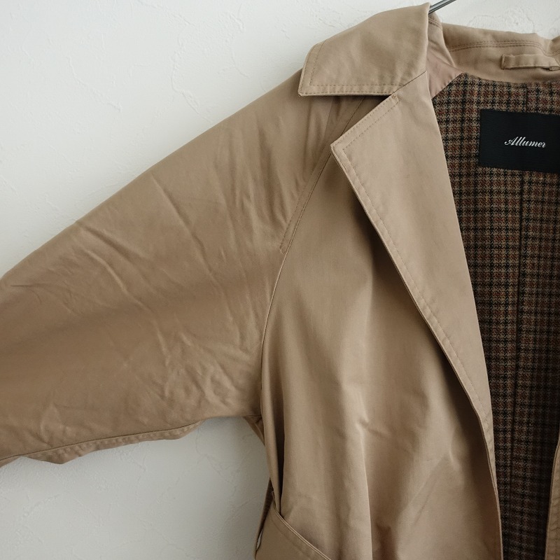 | Allumerのボタンレストレンチコートです。カラーはベージュで、張り感のあるコットンポリエステルの生地で仕立てられています。フロントはボタンレスで、付属のベルトがございます。裏地付きで、身頃部分はチェック地になっており、両サイドにポケット付きです。定価(メーカー希望小売価格) 26,400円の商品です。 |