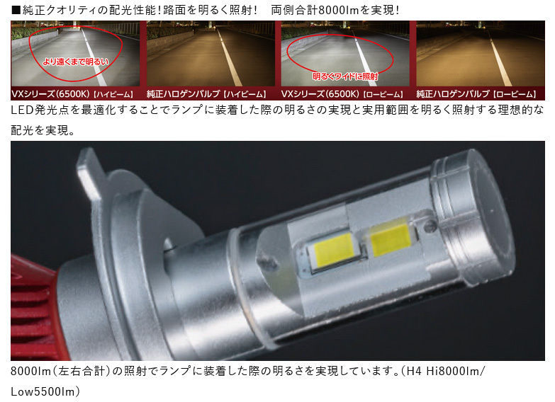 | ■商品説明 | 明るさ追求のために配光設計にこだわり、LED発光点を最適化。照射効率を高めることでランプに装着した際の明るさと純正バルブの配光を実現しています。 ■純正クオリティの配光性能!路面を明るく照射! 両側合計8000lmを実現! LED発光点を最適化することでランプに装着した際の明るさの実現と実用範囲を明るく照射する理想的な配光を実現。 8000lm(左右合計)の照射でランプに装着した際の明るさを実現しています。(H4 Hi8000lm/Low5500lm) ■明るさキープ LED基板には熱伝導性の高い銅とヒートパイプを使用し、バルブ本体で直接挟み込む構造とすることでLEDの熱を確実にバルブ本体へと伝えます。本体には熱伝導性の高いアルミ素材を使用、ヒートシンク部までを一体構造とし電動ファンを内蔵することで熱を確実に放出、安定した明るさを維持します。 ■5色のカラーチェンジフィルム付属 全てのバルブにイエロー、ライトイエロー、ライムグリーン、グリーン、ベージュフィルムを付属。 カラーフィルムを貼る事によってお好みでカラーの選択が可能。フィルムを使用しなければ6500K、イエローは2800K、ライトイエロー3800K、ライムグリーン4500K、グリーン5000K、ベージュ6000Kとなります。 ※H18年式以降の車両には保安基準不適合となるため付属のイエローフィルムを使用しないでください。ライムグリーン、グリーンフィルムを使用時は保安基準不適合となります。 ■コンパクト設計 ドライバーユニット別体のため、バルブ本体に冷却ファンを搭載しながらもコンパクトに設計。ファンサイズの最適化を図ることにより確実な冷却性能とコンパクト化を両立し、ランプ後方スペースの狭い車両(軽貨物車など)にも装着することができます。 ■アイドリングストップ車・ハイブリッド車対応 ■車検対応 ■2年保証 ※H4タイプを取り付け時にハイビームインジケーターが点灯しない場合は別売りのハイビームインジケーター点灯キット(LDJ-HIC)をご使用ください。 |