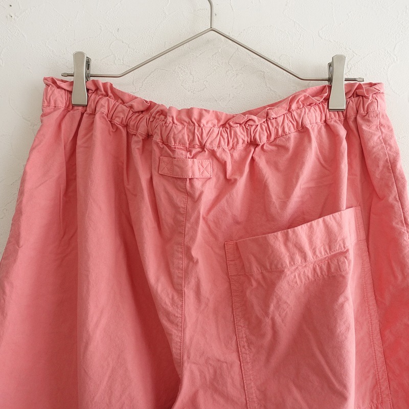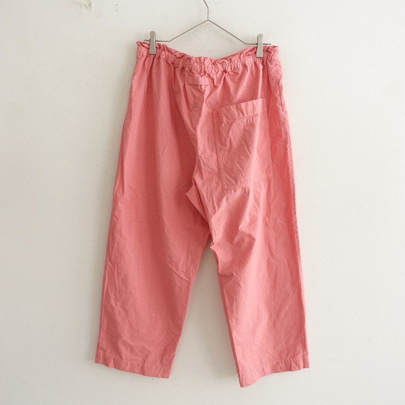 | 2024年コレクション nest Robeのコットンイージーパンツです。カラーは染ムラ・風合いのあるピンクです。高密度に織られたコットンのやや薄手生地を使用。透け感はございません。前立てはフェイクで、ウエストはバックにゴム、フロントに紐入りのイージー仕様です。右ヒップに大きなパッチポケット付き、センターにハンガーループがあしらわれております。前両腰にハンドポケットがございます。定価(メーカー希望小売価格)27,500円の商品です。 |
