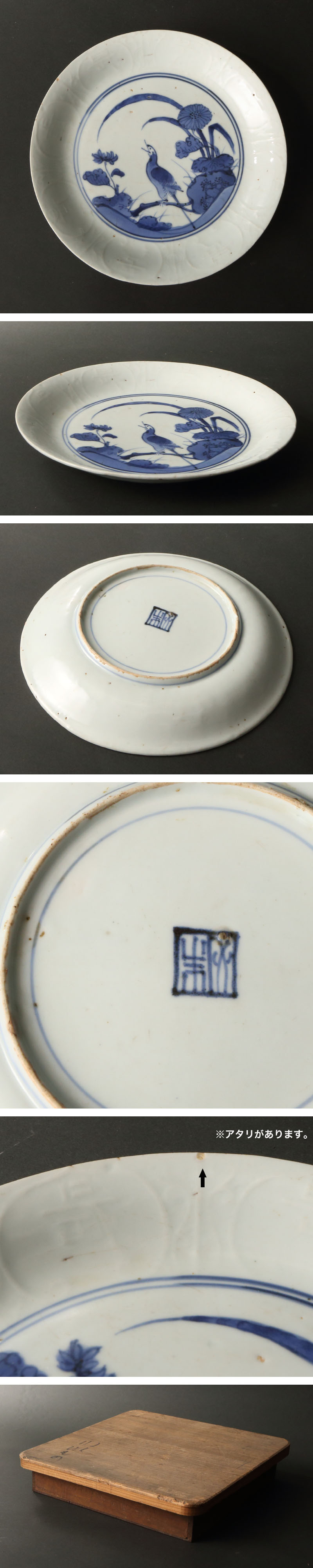 寛文様式の絵皿です。 巌上に佇む鶺鴒を染付しており、初期伊万里からみられる岩鳥(岩浪小禽)文のバリエーションの一つと見られます。 叭々鳥を描く中世禅画や明末清初の中国染付の影響下にありながら、和様の意匠の芽生えが感じられます。鶺鴒にみられる、斜線構図的な文様の配置は同時期の寛文小袖・美人画に共通する美的感覚といえ、余白や対角線構図を好む、琳派など元禄文化の躍動を準備するものでしょう。 また、この時期江戸や京を度々襲った大火、そして町人経済の発展が、絢爛豪華な小袖ばかりでなく染付の内需拡大を実現したといえるでしょう。中世的な唐物愛好から近世的な粋への橋渡しが感ぜられる逸品です。 寸法:高さ2.5cm、幅21cm(最大幅。若干の誤差はご了承下さい) 状態:経年感、アタリがございます。 |
