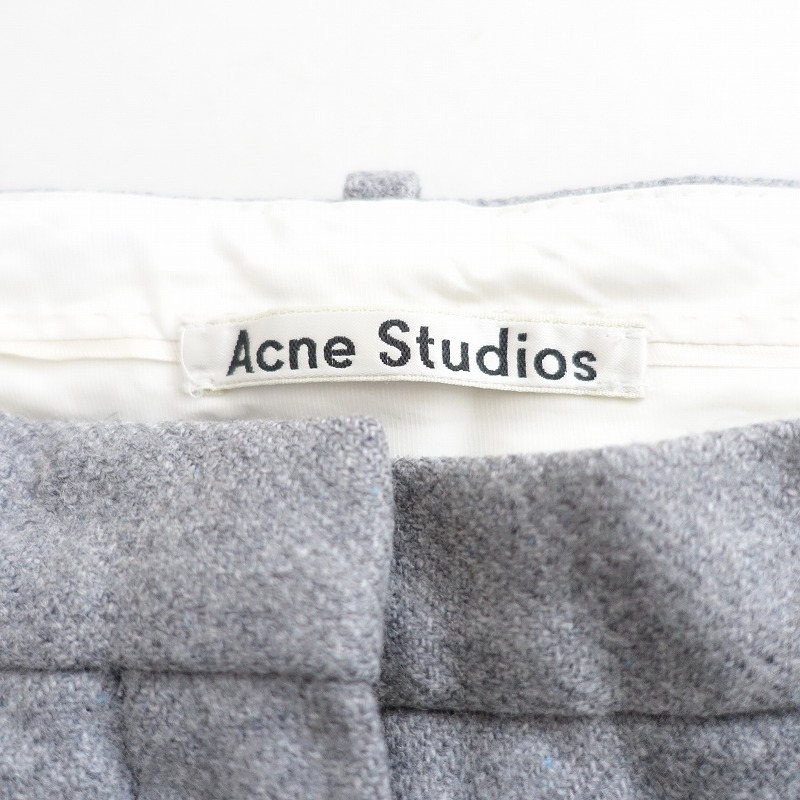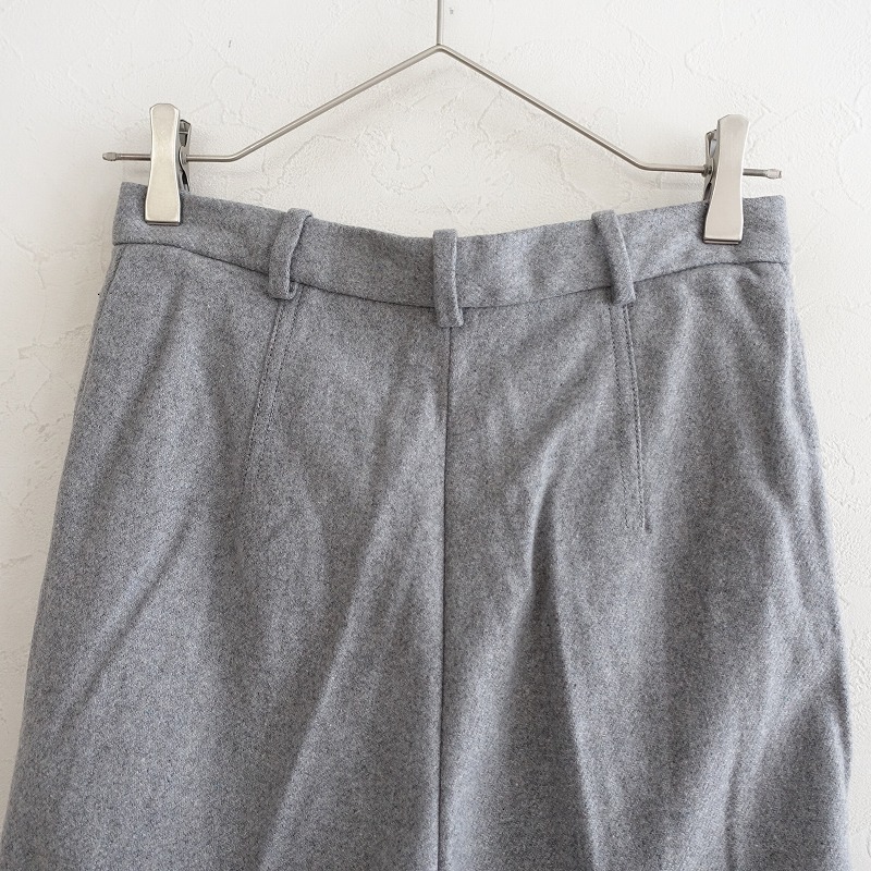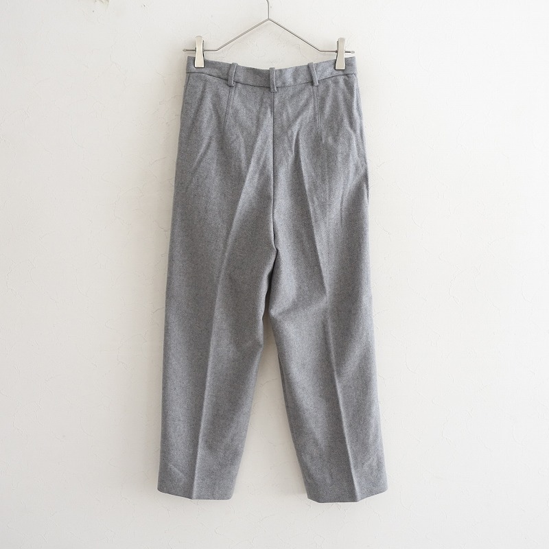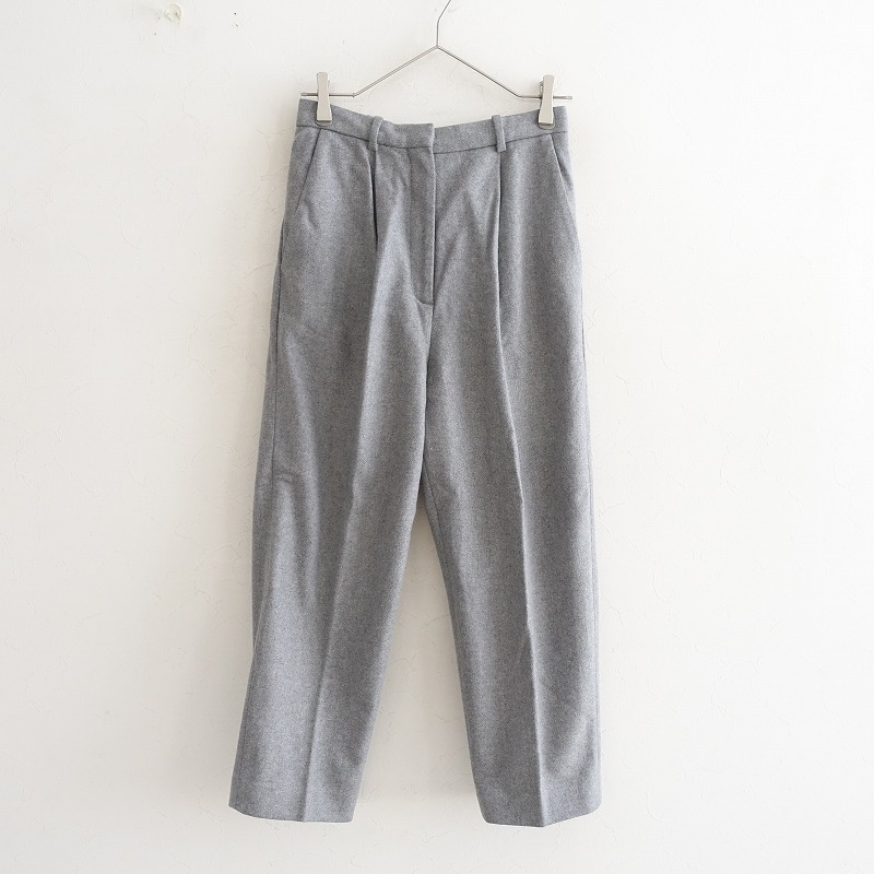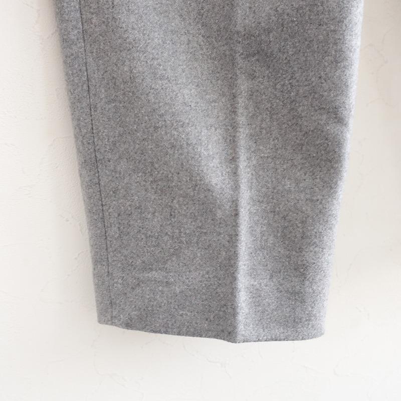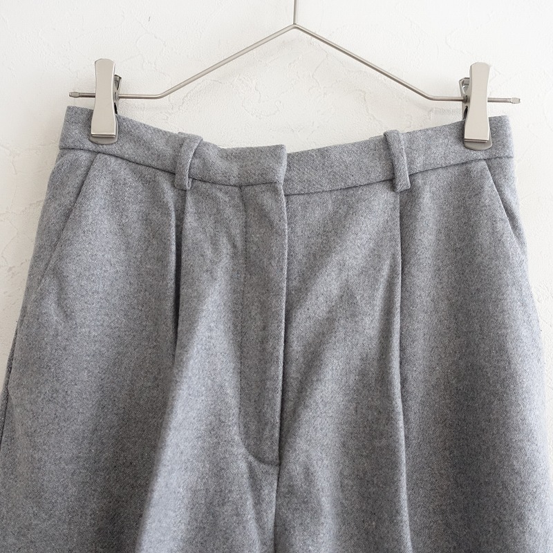 ACNE STUDIOSのウール混タックパンツです。カラーはミックスグレーで、ウール×ナイロン混紡の微起毛素材です。前腰にタック入りで、ホック・内ボタン&ジッパーで着脱できます。前腰左右にポケットがあり、フロントのみ膝辺りまでの裏地付きです。 |