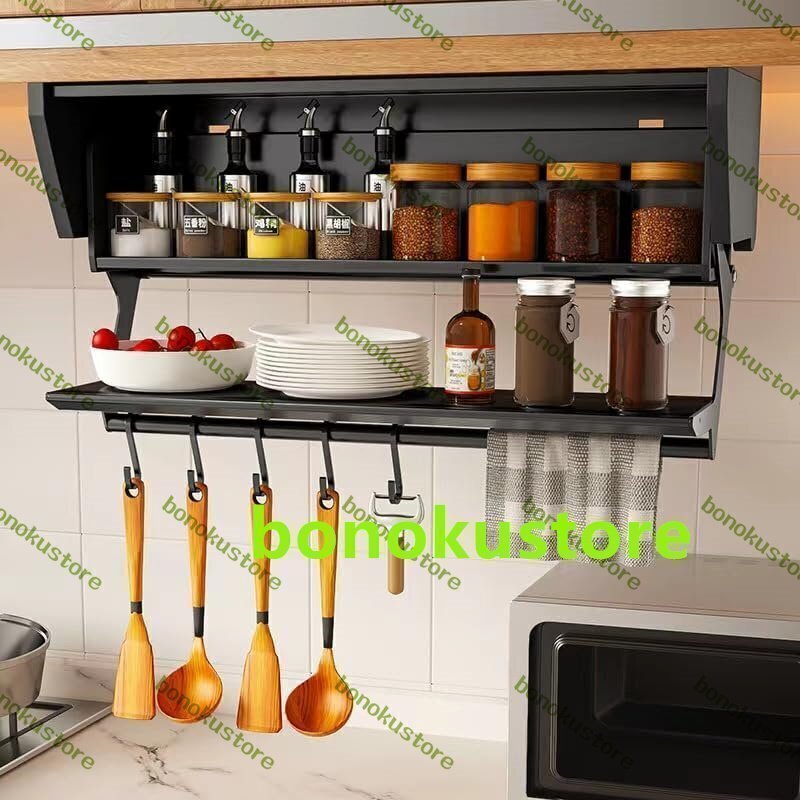キッチン調味料収納棚折りたたみ収納棚多機能ドロップダウン式昇降引籠ハンガー下調味食器棚収納神器ハンガー下調味料収納棚壁収納キャビネット折りたたみ昇降引籠ロッカー (L50*W21.5*H15CM 黒い) 黒い L50*W21.5*H15CM
