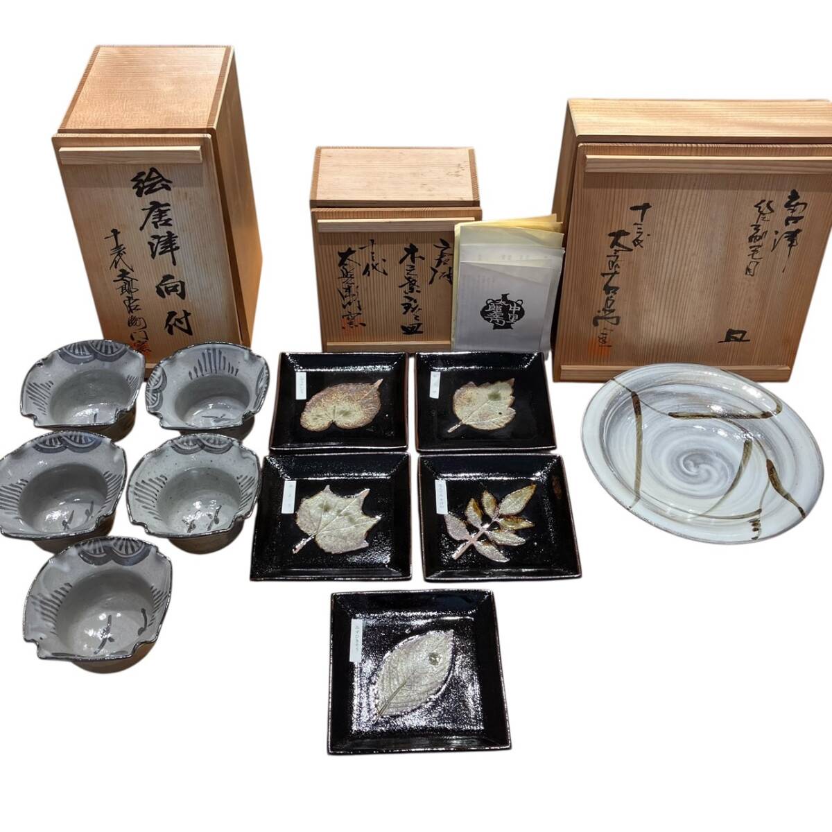 | ★十三代 中里太郎右衛門 絵唐津 向付 唐津焼 木葉文銘々皿 笹文 粉引 大皿 共箱 まとめ 3箱 陶器 骨董品 |