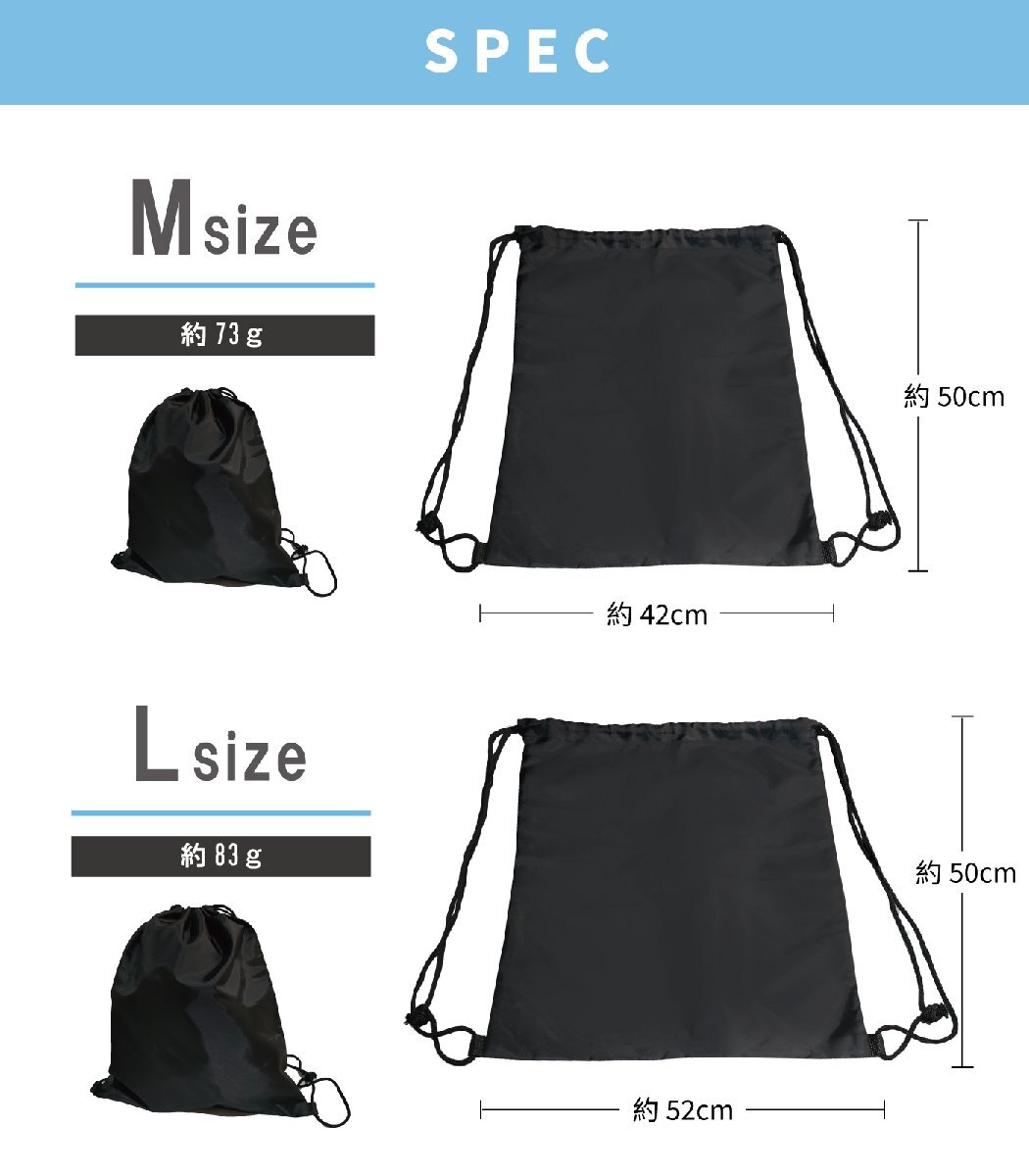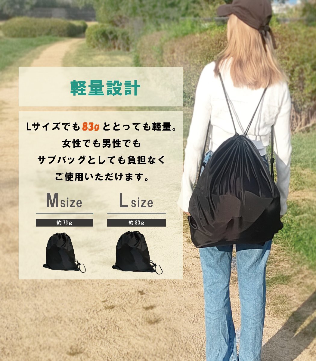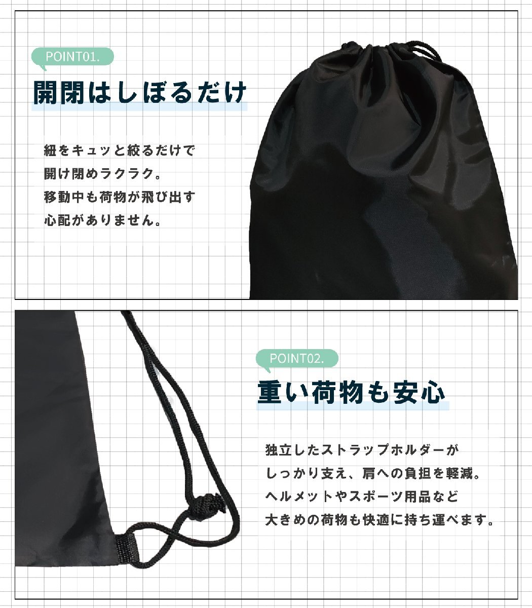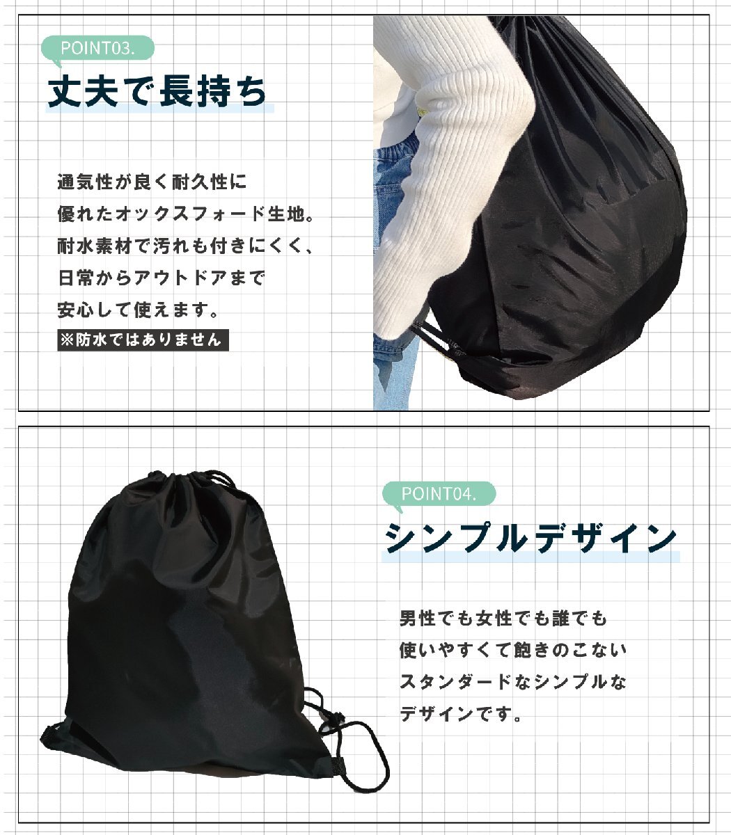 ・ナップサックタイプ:背負えるリュック式デザインで、両手が自由に使える。持ち運びしやすく、コンパクトに折りたためて収納も簡単。