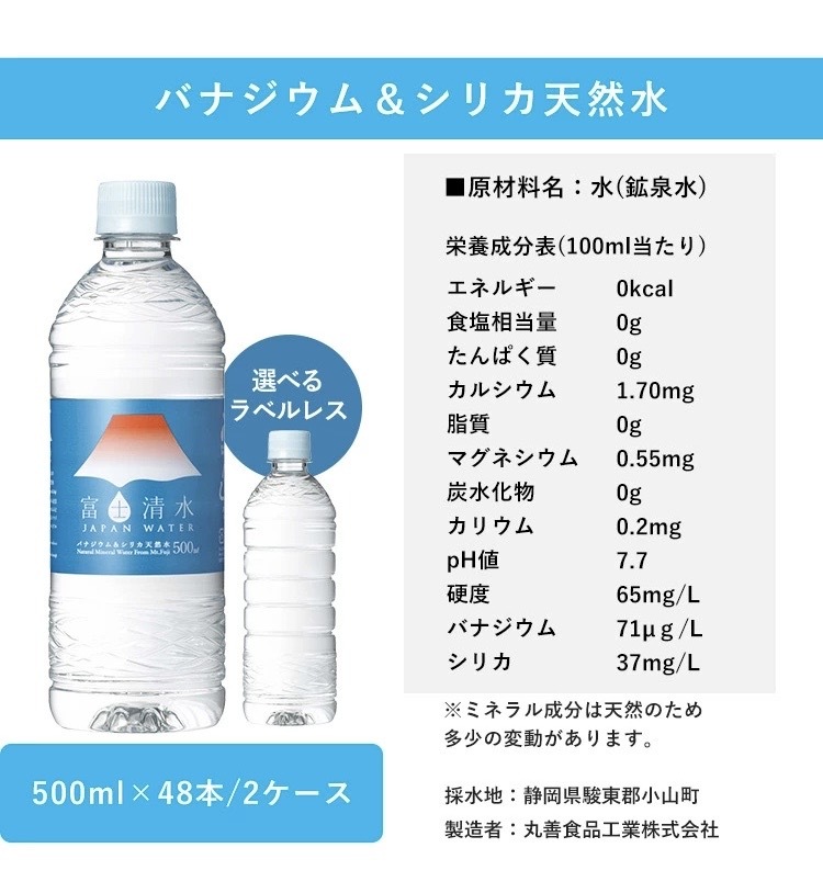 ●成分 栄養成分表示(100ml当たり)エネルギー:0kcal、たんぱく質:0g、脂質:0g、炭水化物:0g、食塩相当量:0g、カルシウム:1.7mg、マグネシウム:0.55mg、カリウム:0.2mg 【任意表示 バナジウム:71mcg/L、シリカ:37mg/L、硬度:65mg/L、pH:7.7】