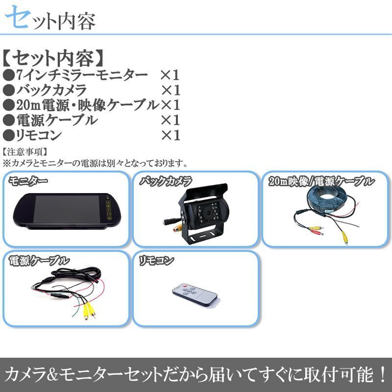 | ■24V車対応の液晶モニター + バックカメラセット 液晶モニターとバックカメラのセットなので、こちらのセットだけで バックカメラをご利用出来ます。 ■7インチミラー液晶モニター 7インチの液晶なので、バックカメラ用としては、満足出来る大きさです。 また、2系統の入力端子を装備しているので、DVDプレーヤー等も別途接続出来ます。 ■赤外線LED搭載バックカメラ 赤外線LED搭載モデルのため、視認性が低下し易い夜間でも一定の視認性を確保出来ます。 また、広角カメラなので視認性も高く、より確実な確認が出来ます。 ■ノイズカットフィルター付き 付属のケーブルにノイズカットフィルターを装着した状態でお届けします。 ※ノイズカットを100%行なうものではございません。 |