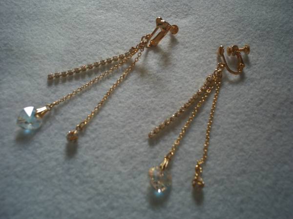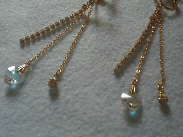 新品・ハンドメイドです。 スワロフスキーのクリスタルカットガラスのハートを中心に作ったロング三連イヤリングです。 ハートのサイズは縦1cmです。 透明にオーロラ加工を施した七色に光るハートです。 金具はロジウムメッキの金色、チェーンも金色です。 ラインストーンは透明です。 ネジバネ式のイヤリング金具で、ハートのカン付です。 レーン・チェーンの長さは約7cmです。(イヤリング金具からハートの先端までの長さ) スワロフスキーのラインストーンレーンも使っています。 |