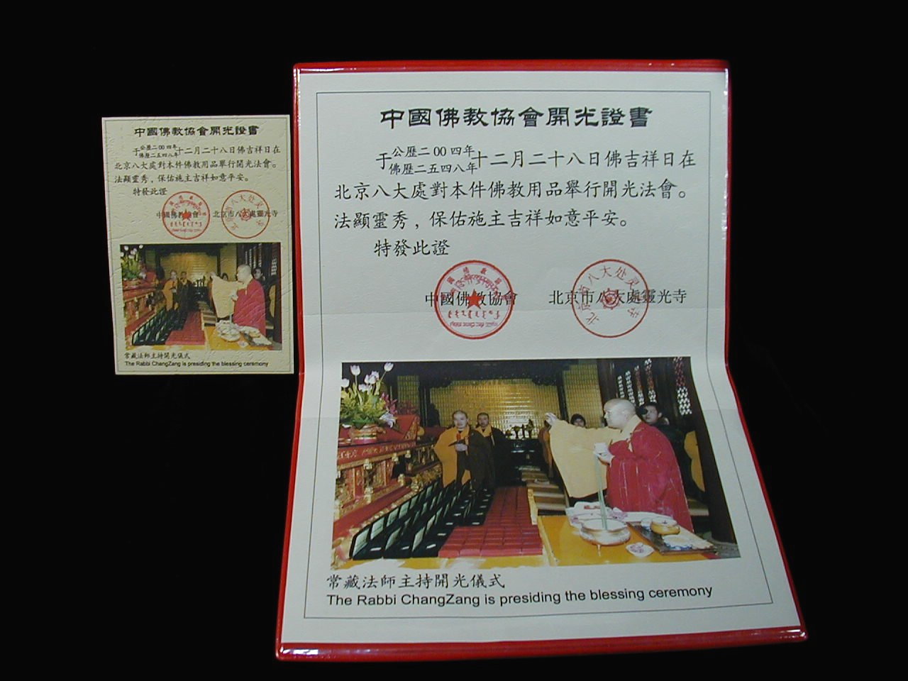 最後の16、17枚のの写真をご覧ください。本品にお付けする開光証書は、中国佛教協会と北京八大処霊光寺により発行されたものです。写真右側の大きい開光証書は、正式の原本です。(1,600件の開光品に対してたった一つの証書が発行されたのみです。小さい正式開光証書は、中国佛教協会と北京八大処霊光寺により発行された本品のための正式開光証書です。)