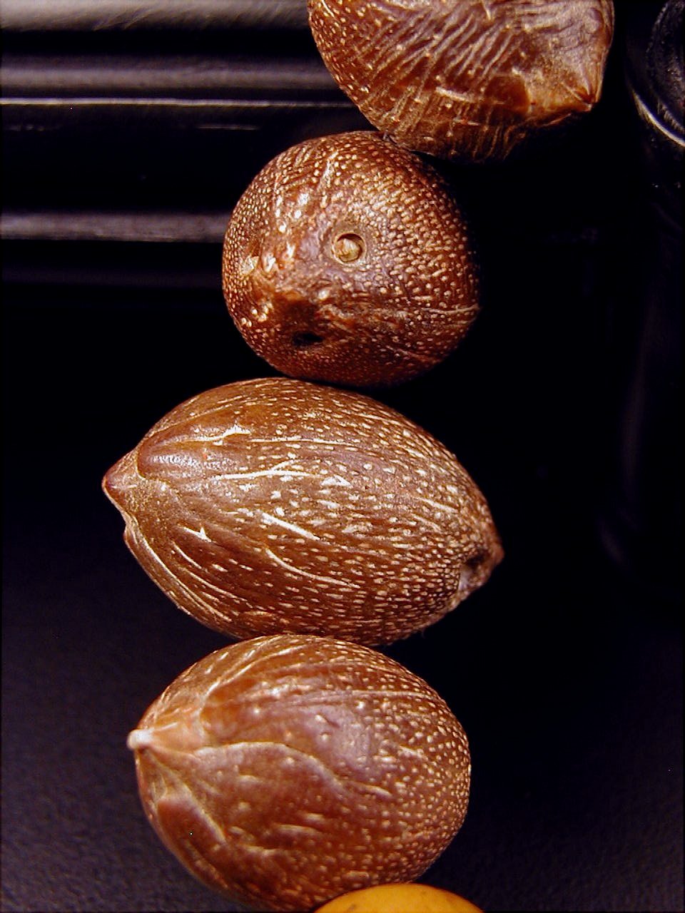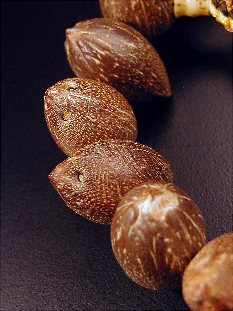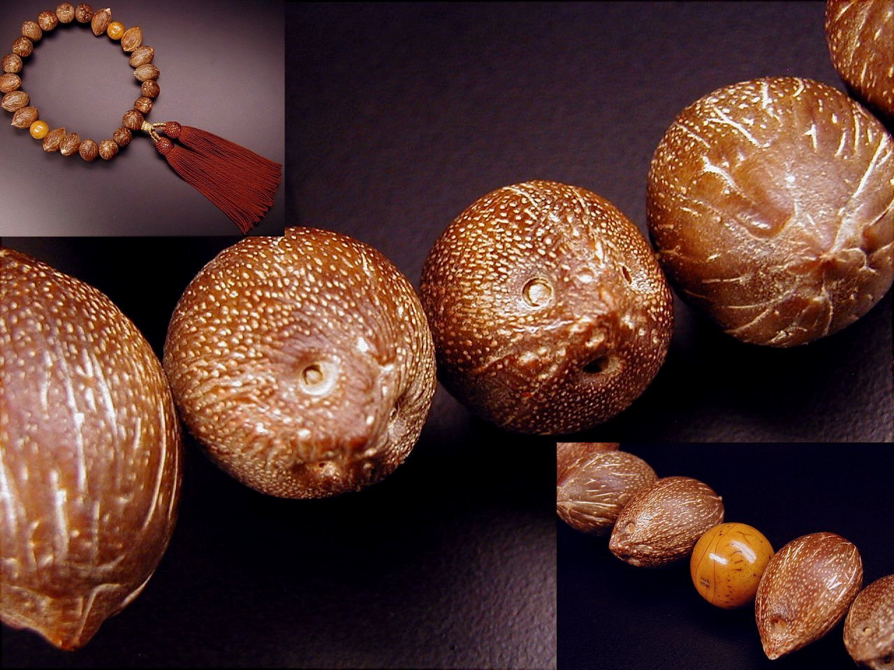 この種の菩提樹の実は、芯実です。トンカチで叩いてみると、石より硬いのがわかります。叩いても割れないばかりでなく、ヒビさえ入りません。時間がある時に手の平に置いて擦ったり、揉んだりした後、手の表面の汗や油脂が玉の木質中に染み込んで色合いや玉の状態に変化が出てきます。時間を経過して、樹の実の玉は、まるで全く玉(ぎょく)のように半透明な状態に変化します。色合いは棗のような純正な朱赤色となります。