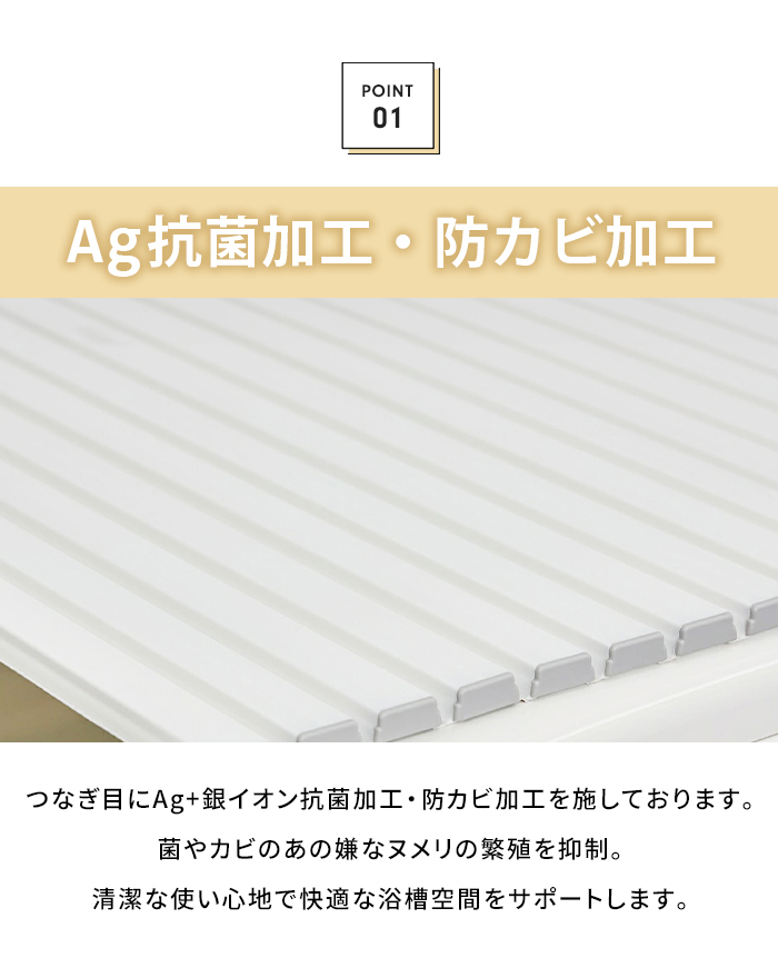 | Ag抗菌シャッター式 風呂ふた。 〔POINT〕Ag抗菌加工&防カビ加工 繋ぎ目にAg+銀イオン抗菌加工が施してあり、菌やカビによる嫌なヌメリの繁殖を抑えて風呂ふたをきれいに保ちます。 〔POINT〕毎日のお風呂掃除が簡単に 表面の溝に沿って軽く洗って水を流せばお掃除完了。 (風呂ふたを洗う際は柔らかいスポンジや中性浴室用洗剤を使用してください。) 〔POINT〕くるくる巻いてすっきり収納 浴室にひろげている風呂ふたをくるくる巻くだけのシャッタータイプ。 クルッとまとめられるので収納スペースが少ないお風呂場にぴったり。 〔POINT〕軽量設計 毎日使うものだから軽量でストレスフリーな使い心地。 軽量なのでお子様からお年寄りの方でも簡単に扱えます。 〔POINT〕安心・安全の日本製。 【使用上のご注意】 ◎購入直後は折りたたみクセが残っていることがありますが、徐々に解消していきます。 ◎24時間風呂ではご使用をお避け下さい。 ◎風呂水洗浄剤(塩素殺菌剤)をご使用しないでください。 ◎柑橘類(柚子・みかん・レモンなど)を使用しますと風呂ふたを傷める恐れがあります。 ◎ベビーバスなどを風呂ふたに乗せて使用しないでください。 |