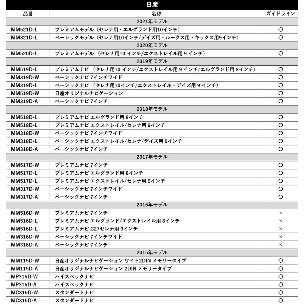 ![]() 日産/三菱 ナビに使用できる 「バックカメラアダプター」です (汎用品ですので純正品と形状は異なります) ■ナビゲーションの交換 ■純正カメラは値段が高い ■前の車両で汎用カメラを使用していた ■ナビはそのままで汎用バックカメラを取り付けたい などに RCA端子でないバックカメラ専用入力に RCA映像出力を装備したバックカメラユニットを接続するための変換コネクターです 簡単取付のカプラーオンタイプ ナビ本体にガイドライン表示機能がある機種はガイドライン表示が可能ですので、ナビ側にて設定を行って下さい 設定方法は各ナビゲーション販売店様へご相談ください ※ 取付は自己責任で行ってください 誤った取付をされると車両に重大な支障をきたす場合がございます その場合は、当方は一切の責任を負いません ※ すべての社外カメラとの組み合わせの動作を保証するものではございません ※ 取付可能なカメラはRCA(映像)端子付きCMOSカメラです ※ CCDカメラにはカーナビ自体が対応しておりませんので取り付けする事は出来ません ※ 取り付け箇所がナビ背面ではない場合があります。説明書・配線仕様図などをご確認ください。 ![]() |