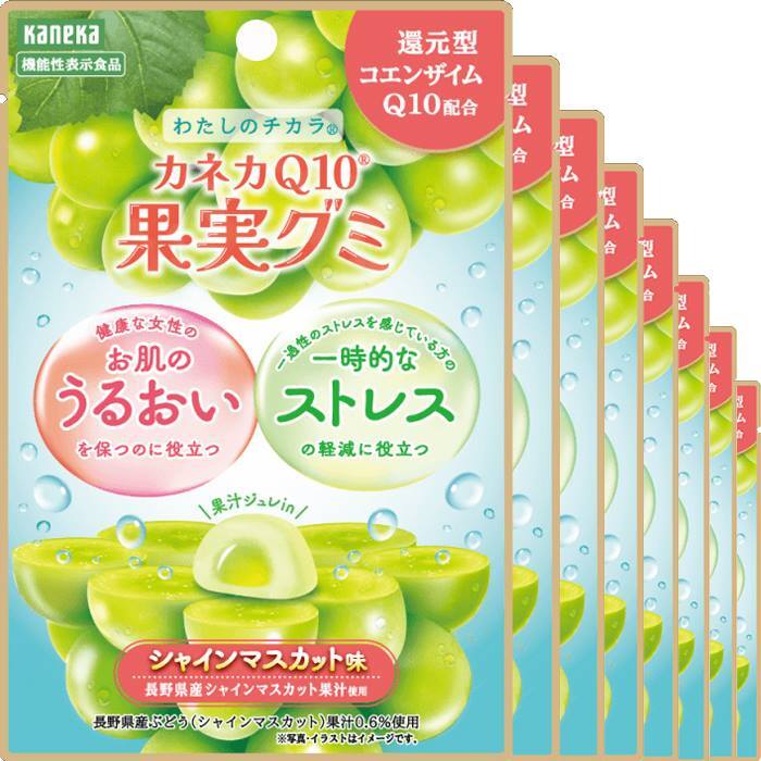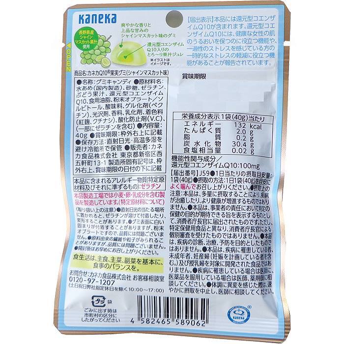| ◇還元型コエンザイムQ10配合のグミです。 ◇お肌のうるおいを保つ&一時的なストレスの機能がある「機能性表示食品」です。 ◇果汁ジュレinの2層仕立て。果実のフレッシュさを感じて頂ける味わいです。 ◇爽やかな香りと上品な甘味が特徴の長野県産シャインマスカット果汁を使用したぶどうマスカット味のグミです。 ☆還元型コエンザイムQ10☆ 還元型コエンザイムQ10は、活動エネルギーを作り出すサポートをしている成分として知られています。 私たちの身体の中にも存在する成分のひとつですが、20代をピークに年齢とともに減少していくと言われています。 一般的な食物からも摂取できますが、十分な量が含まれておりません。 普段の食事で100mgのコエンザイムQ10を摂取しようとするとコエンザイムQ10を豊富に含む「いわし」でも約16匹も食べなければないりません。 体内の細胞に存在するミトコンドリアは、摂取した糖質や脂肪などの栄養分が分解されてできた成分からエネルギーを育成。 このミトコンドリアに多く含まれているのがコエンザイムQ10です。 また、体内に含まれる状態と同じ「還元型」は変換が不要。カラダの中で、そのまま働き、ヒトが本来持っている活力を引き出します。 カネカQ10果実グミは、還元型コエンザイムQ10を、1袋で100mgを補うことが可能です。 |