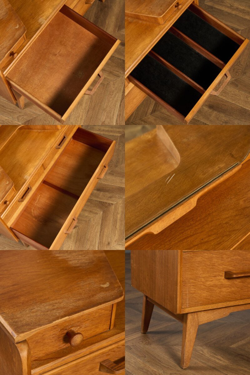 イギリスのミッドセンチュリーを代表するG-PLAN(ジープラン)による、Brandon(ブランドン)シリーズ、オーク材が使用されたドレッシングチェスト / ドレッサーです。 ジープラン最初のシリーズである1953年発表の「Brandon(ブランドン)」シリーズ。トーラ材又はオーク材を用い、丸みの少ない角ばったフォルムが特徴。明るい色合いとミッドセンチュリー期ならではの色気のあるレトロモダンの雰囲気が魅力です。 |