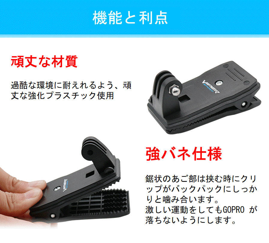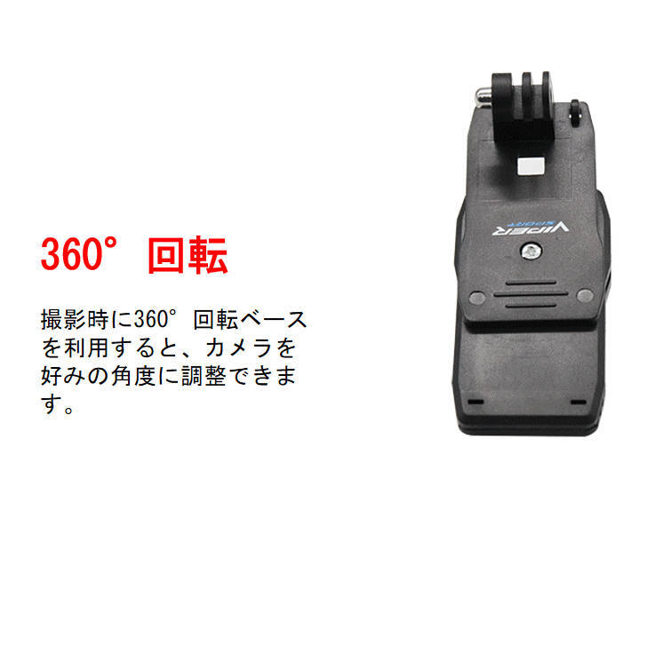 GoProハウジングマウント付クリップ ゴープロGoPro Hero/sessionアクションカメラ対応 パックや襟等いろんな場所に挟める。 対応機種:GoPro5 GoPro6 GoPro7,HERO7, HERO6, HERO5, HERO4, HERO3/3+, HERO5/4Session, DJI Osmo Action ※上記対応機種以外にも、三脚に取り付けできるすべてのカメラでご使用なれます。(要アダプター) 360度回転するのでタテ撮影も可能です。 ※写真は使用例イメージです。この商品にはハウジング・カメラ等々は付属しません。 |