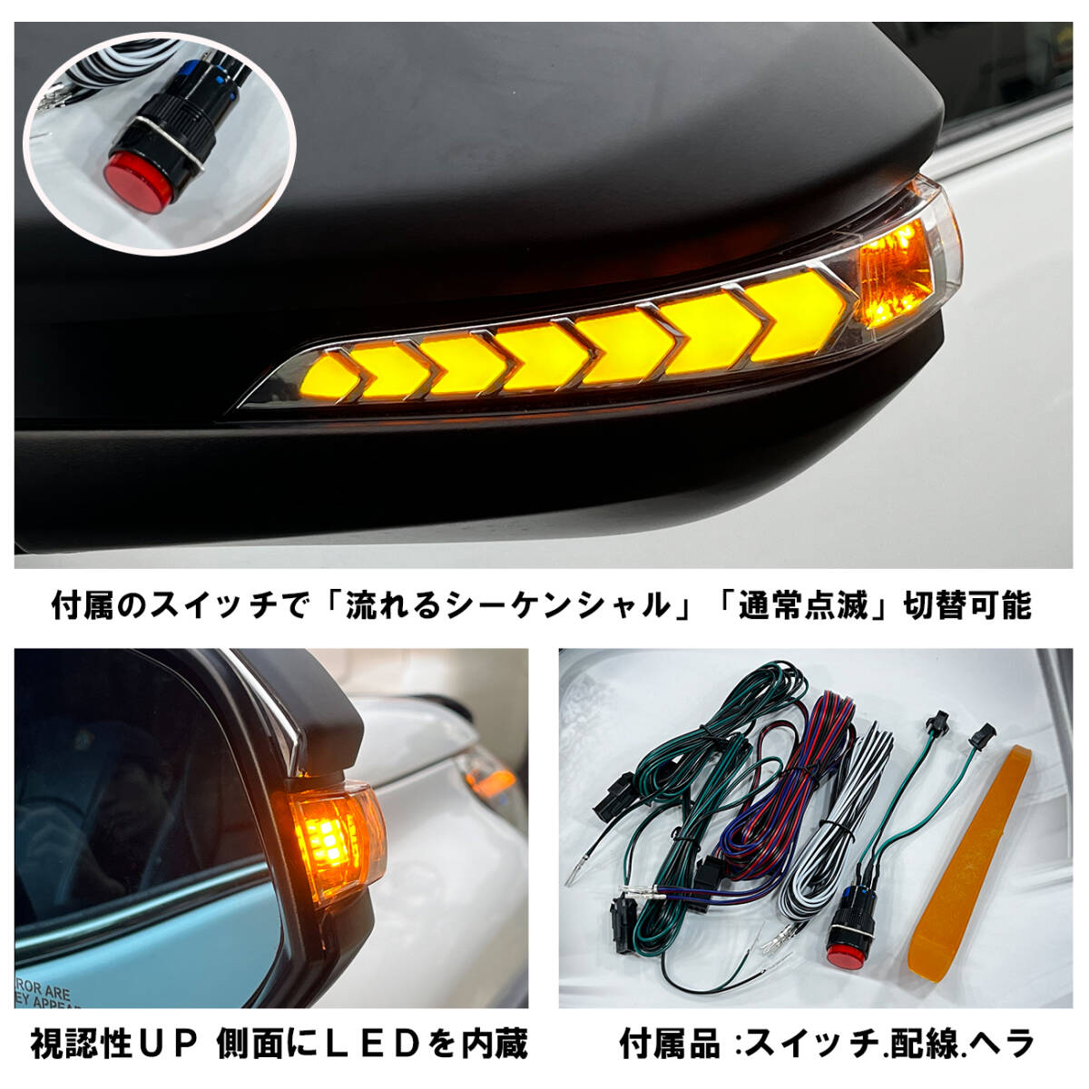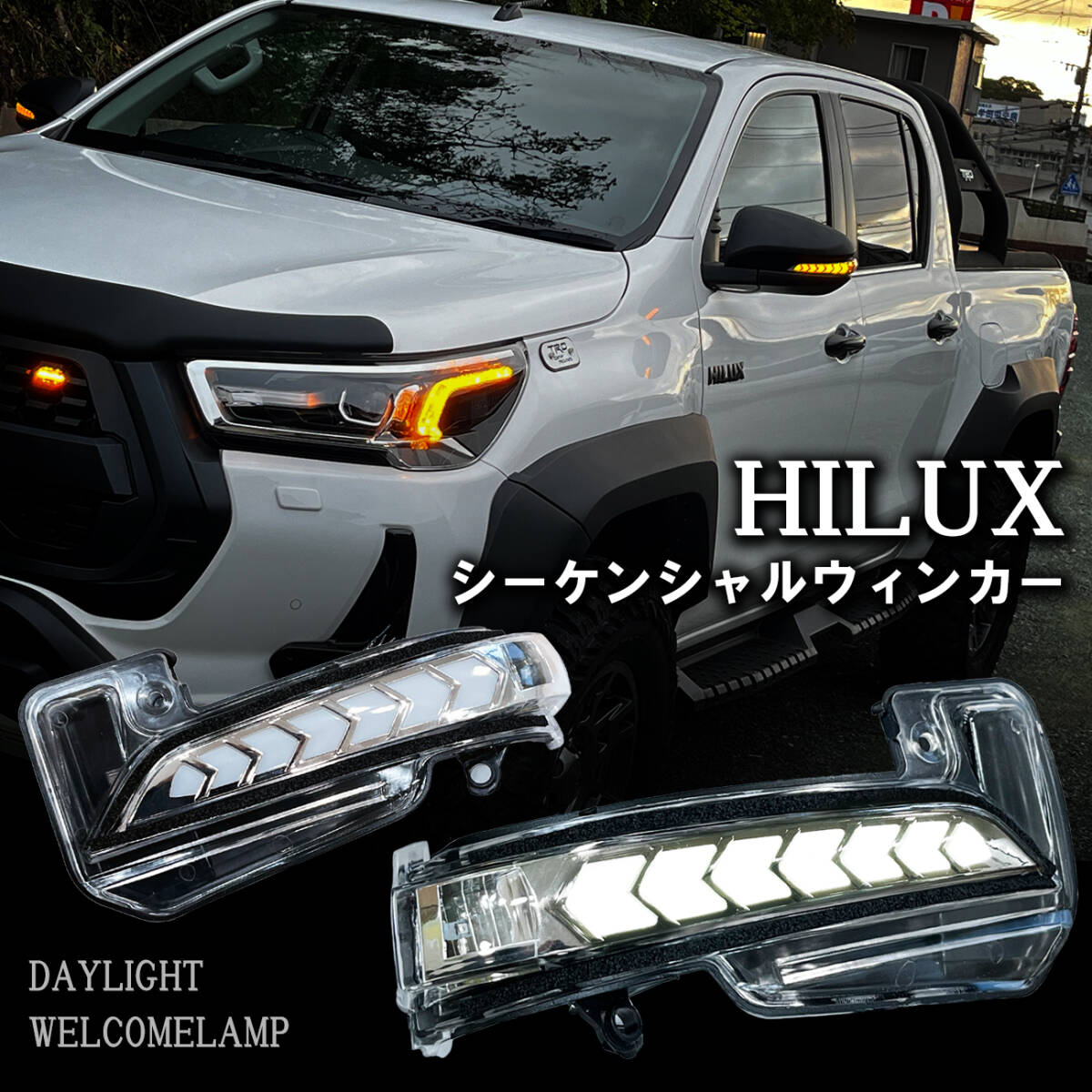 商品名】 ハイラックス GUN125 LEDドアミラーウィンカー 純正交換 【商品詳細】 ・デイライト機能を内蔵したLEDウィンカー ・ウィンカー連動で流れるシーケンシャル機能を搭載。 ・通常時はデイライト(ホワイト)として周囲にアピール!! ・付属のスイッチでウィンカー動作切り替えが可能です。 「シーケンシャル"通常点滅」 【カラー】 ・デイライト:ホワイト ・ウィンカー:アンバー 【セット内容】 ◆ドアミラーシーケンシャル(左右) ×2P ◆延長配線 ◆スイッチ ◆内張りはがし 【適合】 2017年9月(平成29年9月)〜 ・トヨタ ハイラックス GUN125 前期/後期 ※防水、防滴対策のためコーキング加工が必要です。 #リフトアップ #エアロ #オフロード #ハイラックス #後期 #前期 #フェンダー #外装 #GUN125 #HILUX #シーケンシャル #シーケンシャル #デイライト #ライト #ランプ #ウィンカー