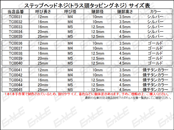M5ステップヘッドネジ (トラス頭タッピングネジ) 1本1本、丁寧に削り出されたタッピングネジに金メッキを施した上から特殊な方法で焼チタンカラーを再現した美しい仕上がりで、特にヘッド部分は通称“ステップ(段)ヘッド”と呼ばれるテーパー状のヘッドに削りを入れ、段を付けた独特なデザインになっています。 ステンレスを使用しているので強度十分! カウリングなどの外装品を止めているネジと交換するだけで簡単にドレスアップが完了です。 ※出品はタイトルおよび右記の“呼び長さ”“カラー”です。 ご落札後の変更はお受けできませんので必ずご確認下さい。 同デザインで違う呼び径・呼び長さ・カラーは⇒ こちら その他の六角ボルト・キャップボルトは⇒ こちら その他のボタンボルトは⇒ こちら その他のネジ(ビス・スクリュー)は⇒ こちら その他のナット・ワッシャーは⇒ こちら |