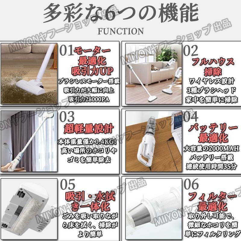 この掃除機は、2000mAhの大容量バッテリーを搭載しており、最大で30分の連続使用が可能です。一度の充電で家全体の掃除が完了するため、充電時間を気にせず使用できます。さらに、低騒音設計により、早朝や深夜でも周囲に迷惑をかけることなく、静かに掃除が行えます。パワフルながら静かな運転音は、日常の騒音ストレスを軽減し、家族や隣人を気にせず快適に使用できるのが魅力です。多重フィルターシステムが微細なホコリやアレルゲンを確実に捉え、清潔な空気を排出します。