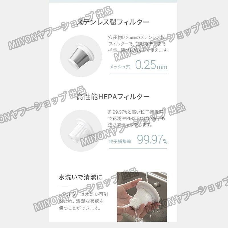 この掃除機には、透明な200mlの大容量ダストカップが搭載されており、ゴミの量を一目で確認できます。ゴミがいっぱいになる頻度が少ないため、掃除中の手間が省け、効率的に掃除が進められます。ダストカップは取り外しが簡単で、水洗いも可能なので、いつでも清潔な状態を保てます。掃除後もダストカップの中のゴミをすぐに捨てることができるため、手間をかけずに清潔を維持できます。視認性の高いデザインは、ゴミの溜まり具合をリアルタイムで確認でき、掃除の効率をさらに高めます。