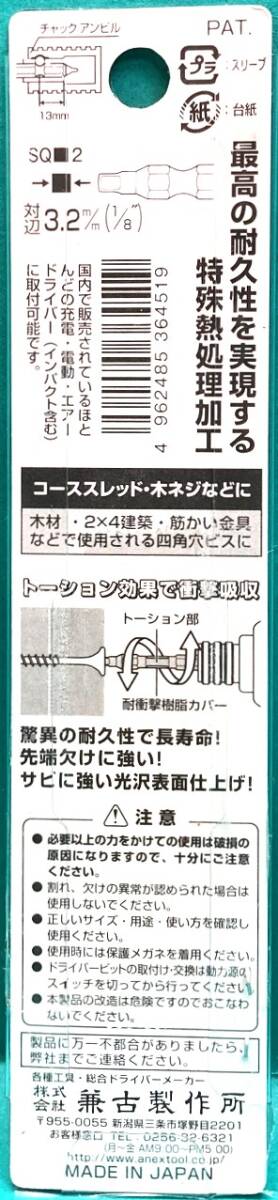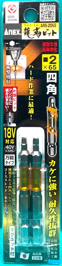 | 商品説明 | カテゴリー:電動インパクトドリルドライバー用ビット 製品名:龍靭ビット メーカー:ANEX(株式会社兼古製作所) 品番:ARS-2065 数量・内容:2本セット L:65mm×6.35mm (SQ■2ネジ用 対辺3.2mm/1/8”) 材質:特殊合金 マグネット付き 対応機種:18V対応品(40Vにも対応) 状態:新品未使用・未開封 日本製(MADE IN JAPAN) ★最高の耐久性を実現する特殊熱処理加工 驚異の耐久性で長寿命 先端欠けに強い サビに強い光沢表面仕上げ! ★トーション効果で衝撃吸収 ハードな作業に最適 ★コースレッド・木ネジなどに使える万能タイプ 木材、2×4建築、筋かい金具などで使用させる四角穴ビスに ★国内で販売されているほとんどの充電・電動・エアードライバー(インパクトを含む)に取り付け可能 ★片頭ビット アンビルに噛み込まない |
