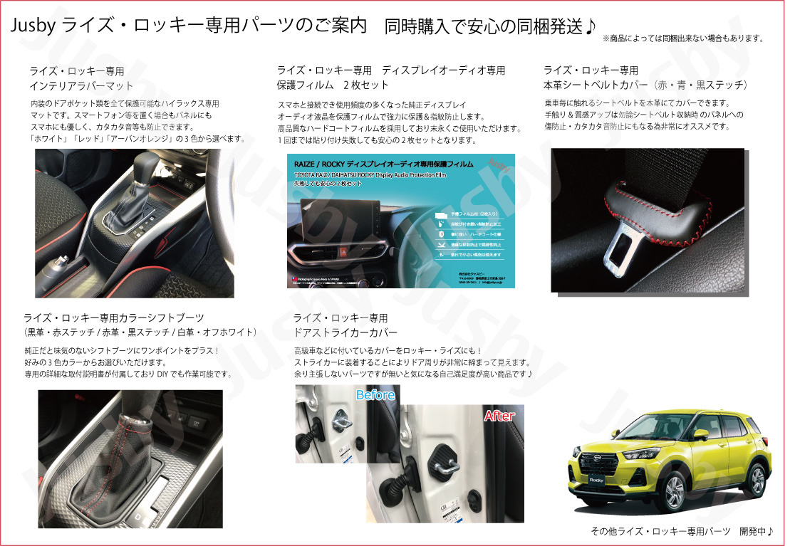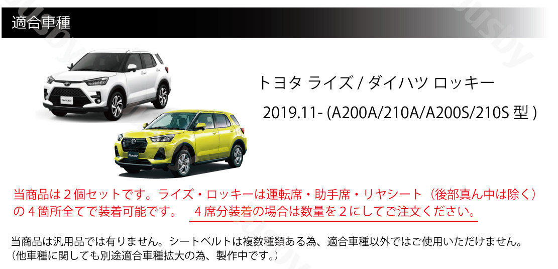| トヨタ ライズ RAIZE/ダイハツ Rocky 専用 本皮シートベルトカバー(黒ステッチ) 2個セットです 車種専用本革シートベルトカバー 2個セットです。ライズ・ロッキーに装着可能です。 ステアリングやシフトノブと同様に乗車毎に必ず触れるシートベルトを本革にてカバーできます。 手触り・質感アップは勿論シートベルト収納時 のパネルへの傷つけ防止・カタカタ音防止にもなる為非常にオススメです。 カラーは 赤ステッチ・青ステッチ・黒ステッチの3種類からお選びいただけます (落札後は色変更出来かねます。商品タイトルの色をご確認ください) 当商品は2個セットです。 ライズ・ロッキーは運転席・助手席・リヤシート×2個(中央は除く) すべて装着可能です。4席分必要な場合は数量を2個にしてご注文をお願い致します。 当シートベルトは汎用品では有りません。 シートベルトサイズは数多くの種類がある為適合車種以外ではご使用いただけません。 平縫いとクロスステッチを使用して縫い上げを行い、2種類の糸を使用して強度とデザインにこだわった商品です。 シートベルトの装着・取外し時など触れる毎に本革レザーの上品な質感を感じていただけます。 取付方法は簡単な付属両面テープでの固定または、付属糸で確実な装着&見た目もアップする手縫いによる固定の2種類があります。 お好みの方法で装着してご使用ください。 ( ・∀・)Φスタッフレビュー 通常はプラスチック剥き出しで冷たいシートベルト部分が当商品で一新します。厚みもアップして手触り・見た目の高級感もアップします。 ピラーなどに当たってカタカタ音がなっていたりする事もなくなりました。乗車毎に触れる部分なので装着後の満足度は非常に高くおすすめです♪ |