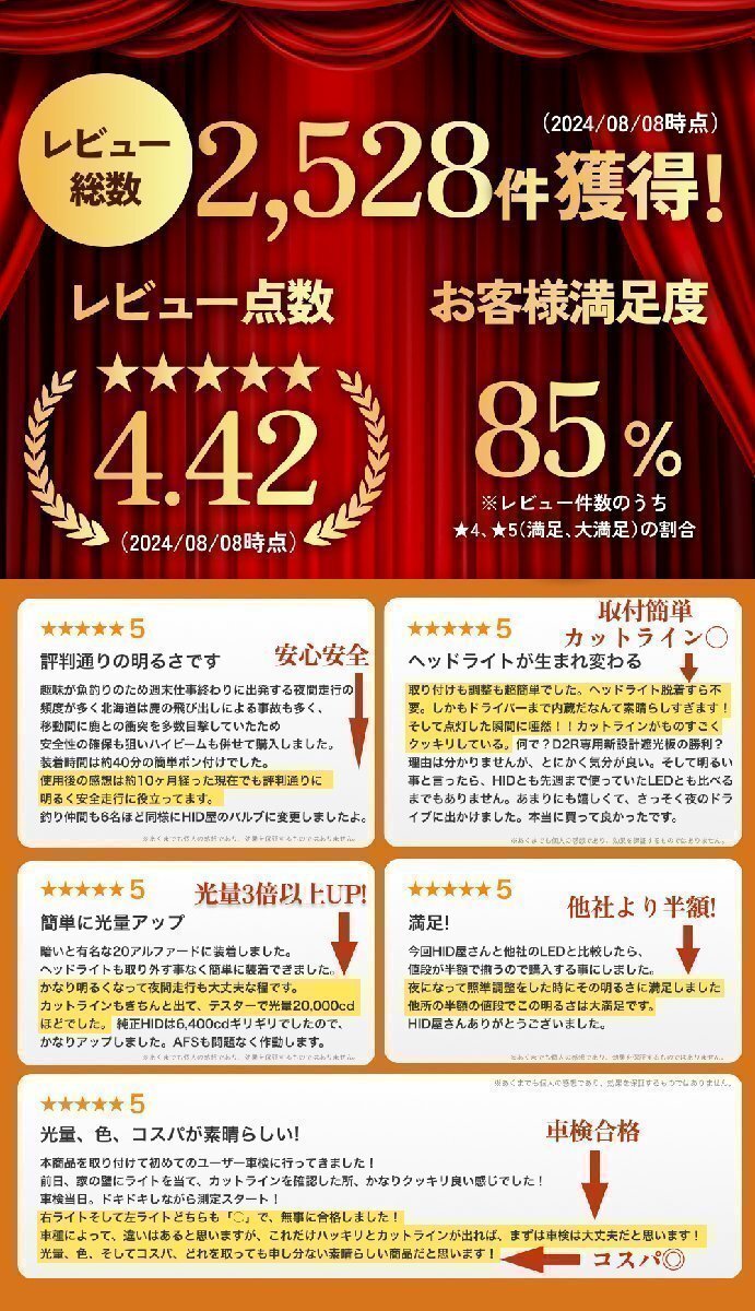 【←商品の詳しい取り付け動画、ビフォアー、アフター動画はこちら】| 【バルブ形式】D4S/アルファード/ヴェルファイア専用 【ケルビン数】 6500k 【明るさ】 1灯あたり20,200cd(カンデラ) ※数値は車種やレンズ、取付の状態、バルブや測定器の種類によって変動します。 ※Dシリーズ中1種類のバルブで測定しています。 【バルブサイズ】 ■ブラックボディ: 76.9mm(縦) ×41.6mm(横) ■シルバーボディ:74mm(縦) × 38mm(横) ・純正HID搭載車であれば、大半の車種に適合するように設計されています。 ※車種によっては取付スペースが狭くて、稀に装着できない場合がございます。 ※本製品は自動車メーカー製の純正バラストにのみ対応しております。社外バラストでご使用される場合の動作は保証できませんので予めご了承ください。 ※本製品は自動車メーカー製の純正バラストにのみ対応しております。社外バラストでご使用される場合の動作は保証できませんので予めご了承ください。 ※後方のスペースを含む取付ヘッドライトのサイズをご確認いただき、取付箇所のスペースも必ずご確認ください。 【冷却ファン】 36DB静音ファン搭載 【防水防塵】 IP68 【消費電力】 35W 【電圧】 12V車専用 【保証】 2年保証 【付属品】 ●LEDヘッドライト×2 ●取扱説明書×1 【商品説明】 HID並の光量と抜群の視認性。 圧倒的な爆光と耐久性で抜群のコスパ 6500Kのホワイトヘッドライトで視認性向上 明るさと耐久性がありながら低価格化を実現 【商品詳細】 ■HIDバラストに接続するだけで簡単にヘッドライトヘインストール可能なLEDバルブ! ・この純正LEDヘッドライトは、純正バラストのソケットに接続するだけです。 ・バルブ交換の感覚で鋭い6500ケルビンの白色LEDヘッドライトに変更できます。 ・HIDよりも明るく瞬時に明るさがMAX100%になります。 ■純正HIDを加工不要で簡単「LED化」バルブ交換と同じ要領で交換作業が簡単! ・バンパーの取り外し不要 ・ヘッドライトの取り外し不要 ・バラストからドライバー(コンバータ)へ交換不要 ・従来のコンバージョンLEDバルブと比ベソケット後方部分が薄くなりサイズさえ合えばほとんどの車種に装着対応可能です。 ・車両のハーネス加工不要でバルブ交換の要領でHIDからLEDへ変更することが可能です。 ※一部の車種でバンパーの取外しやヘッドライトの取外しが必要な場合がございます。 ■純正HIDより光量160%アップ! ・純正HIDからLED化するタイプの中ではこれがベストだと思います。 ■HIDを超える明るさで車検合格! ・弊社の隣にある練馬車検場でも合格しています。(20ヴェルファイア) (本製品は保安基準の性能要件を満たすよう設計しておりますが 、 ヘッドライトのレンズ、リフレクターの状態又は相性や、 バッテリーの電圧低下などが原因や純正バルブとは異なった光に見えることで、 ごくまれにですが車検に通らない場合があります。 万が一、そのようなことがありましたらお手数ですが当店までご連絡してください) ■優れた配光で大光量を実現! ・特注の明るいLEDチップをHIDバルブの発光部と同位置に配置。 ・両面のLEDの隙間を極力薄くしHIDバルブの発光部を再現する事で理想的な光と明るさの照射が可能になりました。 ・全体が明るいワイドな完全配光! ・純正HIDと同じように配光は100%近く正確です。 ■熱伝道率の高いアルミニウム合金で明るさと寿命を維持 ・電圧の変化しやすいアイドリングストップ車やハイブリッド車でも安心してLEDを安定して大光量でご使用いただけます。 ・バルブ先端から台座の放熱フィン部分まで、熱伝道率の高いアルミニウム合金で全体を一体成型にしています。 ・バルブ内部には温度センサーを内蔵していますのでLED素子の破損を防ぎ長寿命で故障が少ないです。 ■優れた放熱性! ■光軸の調整可能! ・360度回転するバルブフランジ。回すだけで配光の調整ができます。 ・バルブの向きは特に決まりはありませんので、車種に合わせて調節してください。 【注意点1】 こちらの製品は国産車専用です。予めご了承ください ※リフレクタータイプのヘッドライトでかさ付きの場合は配光が出ない場合がございます。予めご了承ください。 ■通常バルブ形式が適合している場合、99%装着に問題はございません。 バルブ形式は車種別適合表にてご確認いただけます。 また、ときよりサイズが長くて裏蓋が完全に閉まらないこともございますので、お手数ですがバルブ寸法をご確認いただければと思います。 万が一、閉まらない場合は、裏蓋を切って加工した画像を参考にして頂くか、もしくはオプションパーツのメニューにあるダストカバー(ヘッドライトカバーケース)もご用意してありますのでご一緒にご検討してみてください。 ■こちらの製品は国産車専用です。予めご了承ください ■AFS仕様車に装着する時のご注意:AFS作動時には電源ソケットとコントローラーが干渉しないように設置してください。 【不適合が分っている車種】 ■スバル:インプレッサ系の